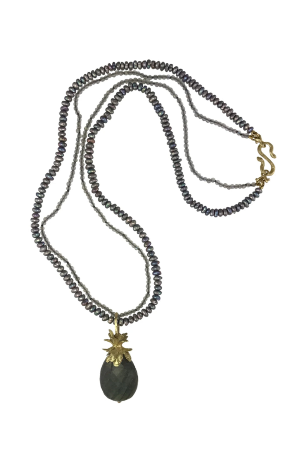 double strand labradorite-2mm strand and 4x5mm rectangle faceted with center 18k pineapple cone South sea Black fresh water pearls baroque pendant, 18k wing S clasp
