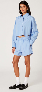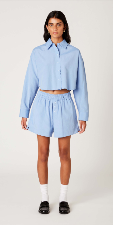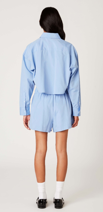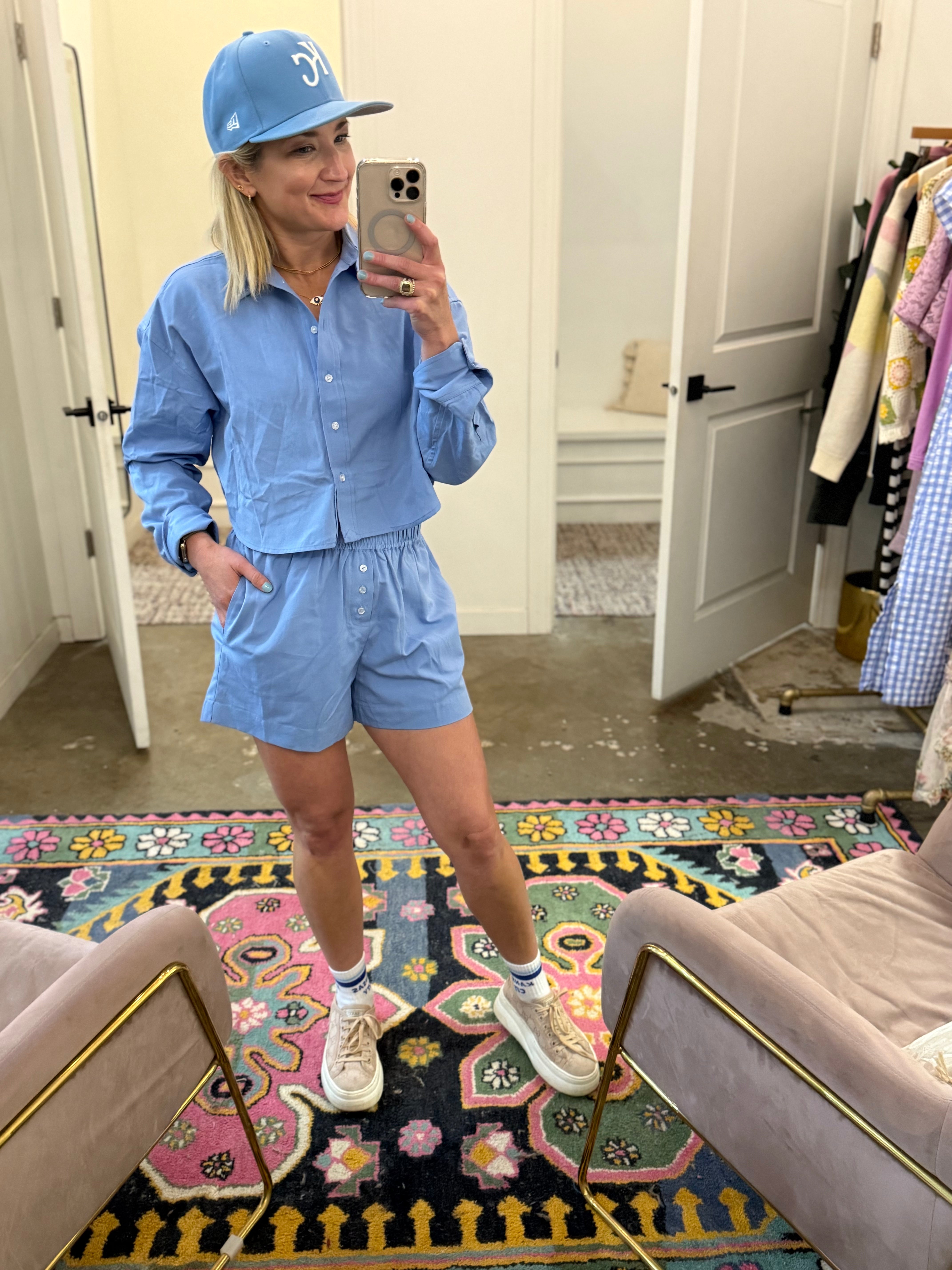 This classic button up is a cropped fit, a beautiful color, has a collar and is a boxy fit. Pair with the matching shorts for a fun classic look.