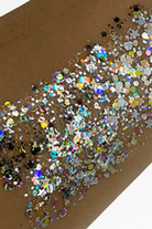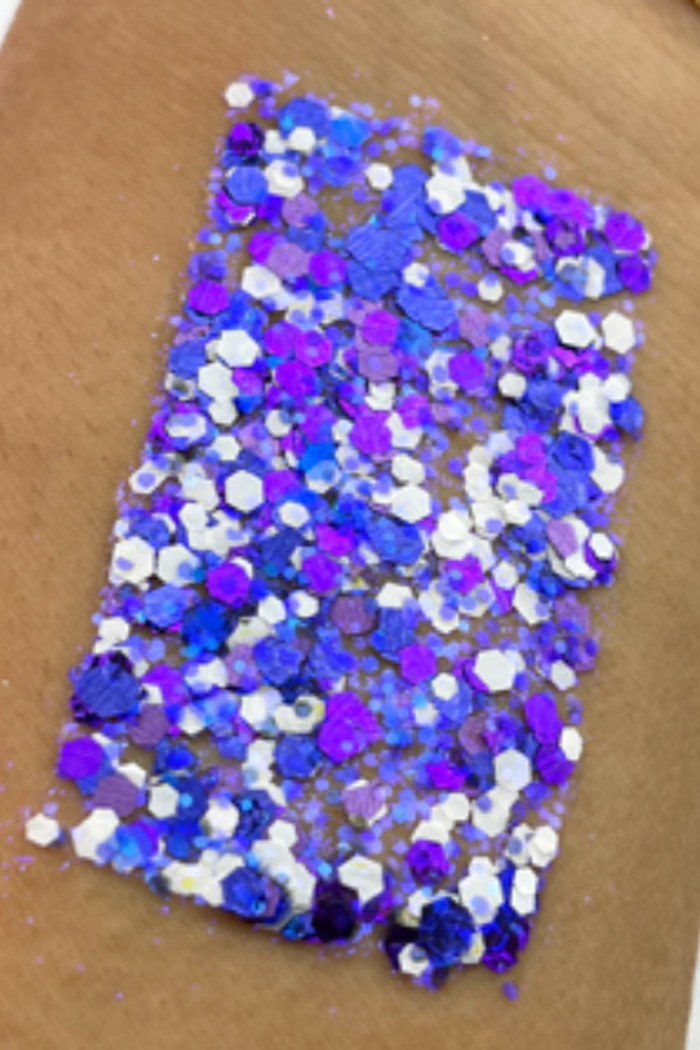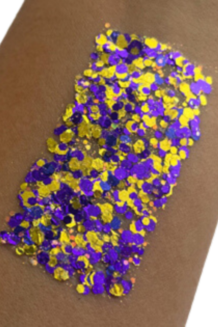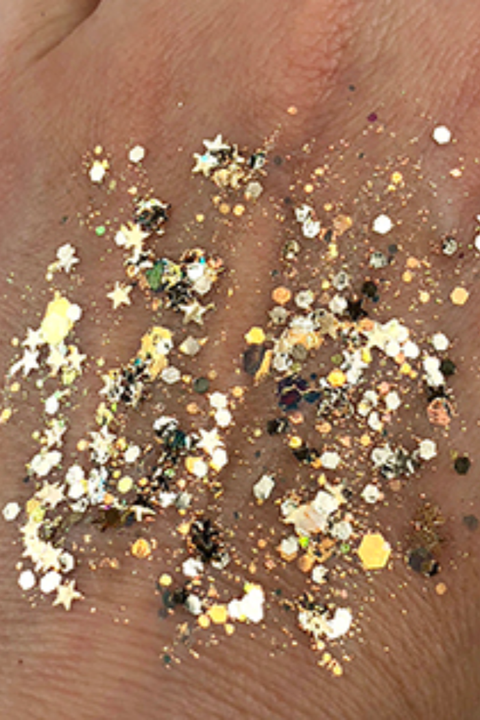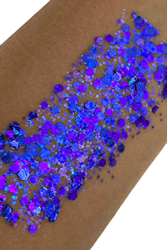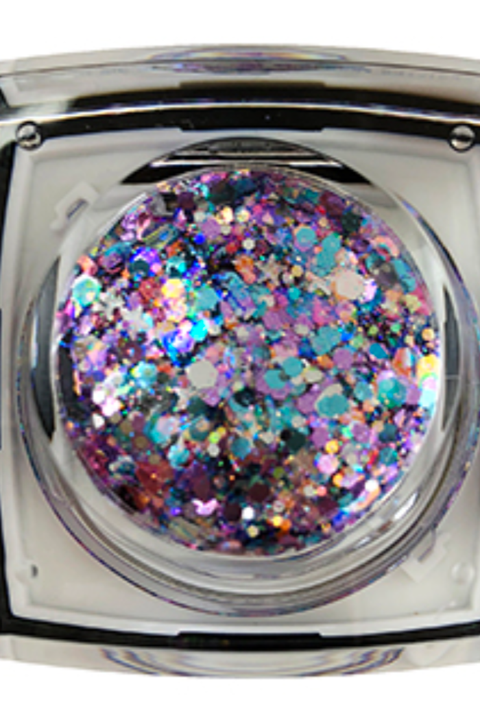 Elektra Cosmetics Bolt Balm is an intense blend of chunky and fine glitters custom mixed in an aloe vera gel base. It’s perfect for hair, body, face, or highlight but is NOT eyelid safe.