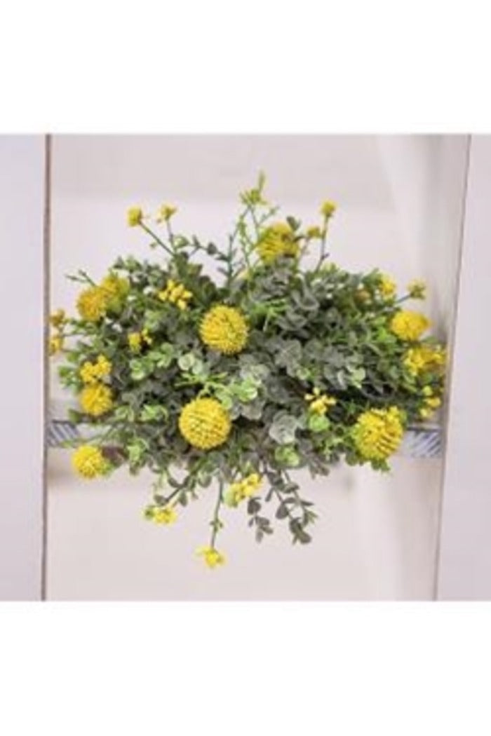 Garden Bliss Half Sphere features plastic, yellow, woolly heads and eucalyptus leaves on flexible green stems. Use as a shelf or tabletop display or to fill a container for a bright, spring or summer accent. Half sphere measures 10" wide by 2.5" high.
