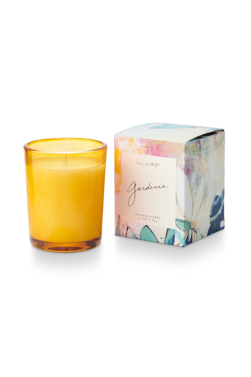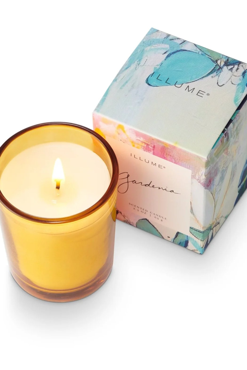 A limited edition tinted glass votive, tucked inside a gift-ready box featuring the abstract paintings of ILLUME founder, Lynette Reed.