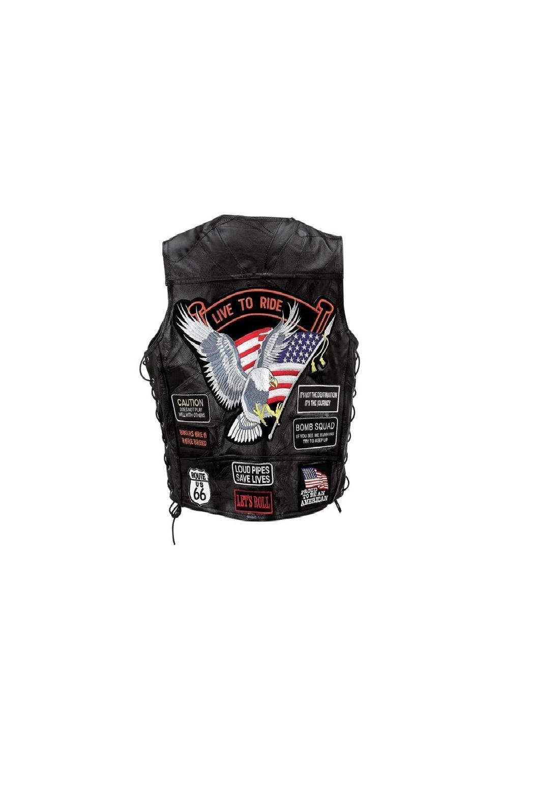 The Diamond Plate™ Rock Design Genuine Buffalo Leather Biker's Vest features an impressive collection of 14 Embroidered Cloth Patches already sewn in place on the front and back of the vest.