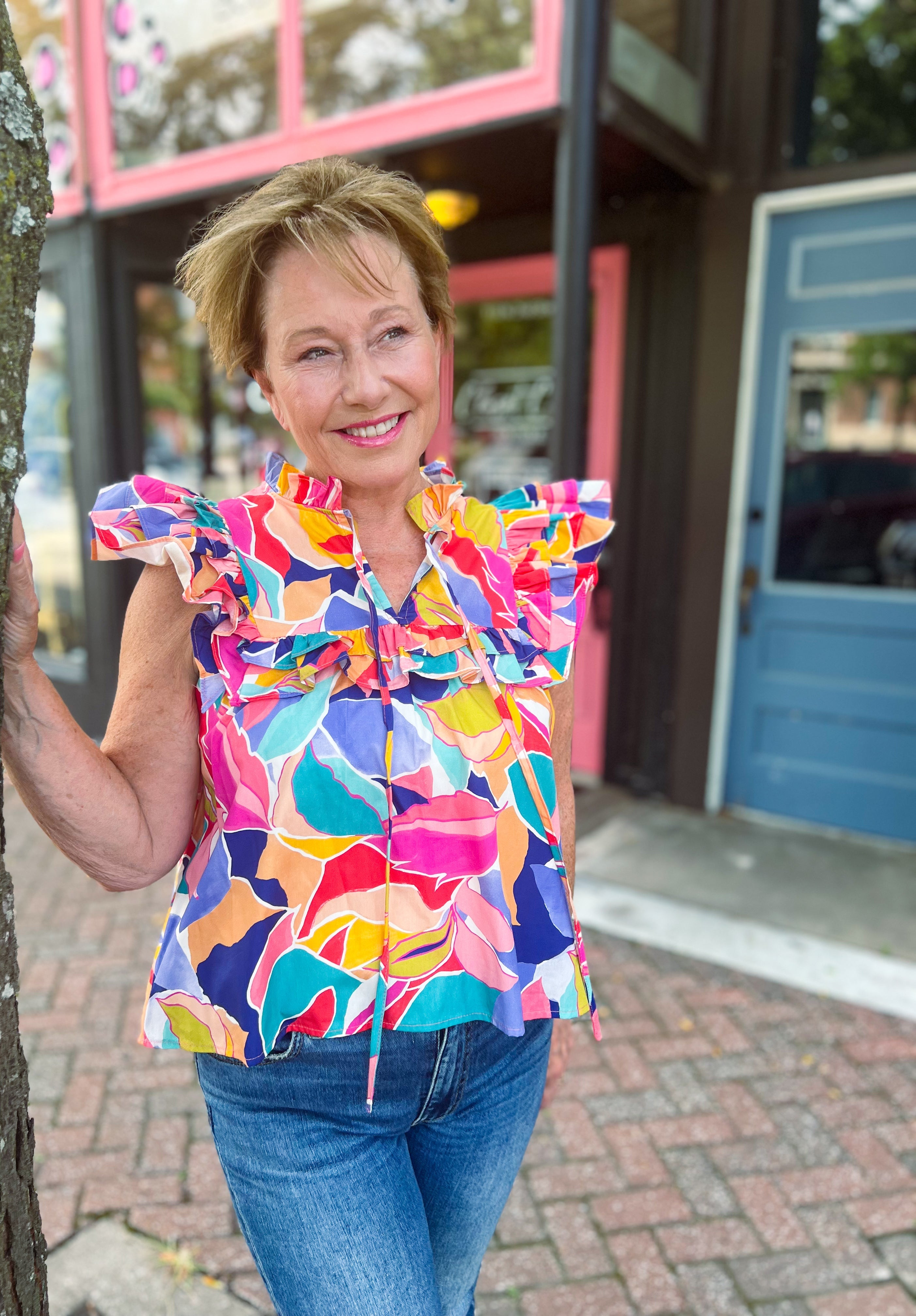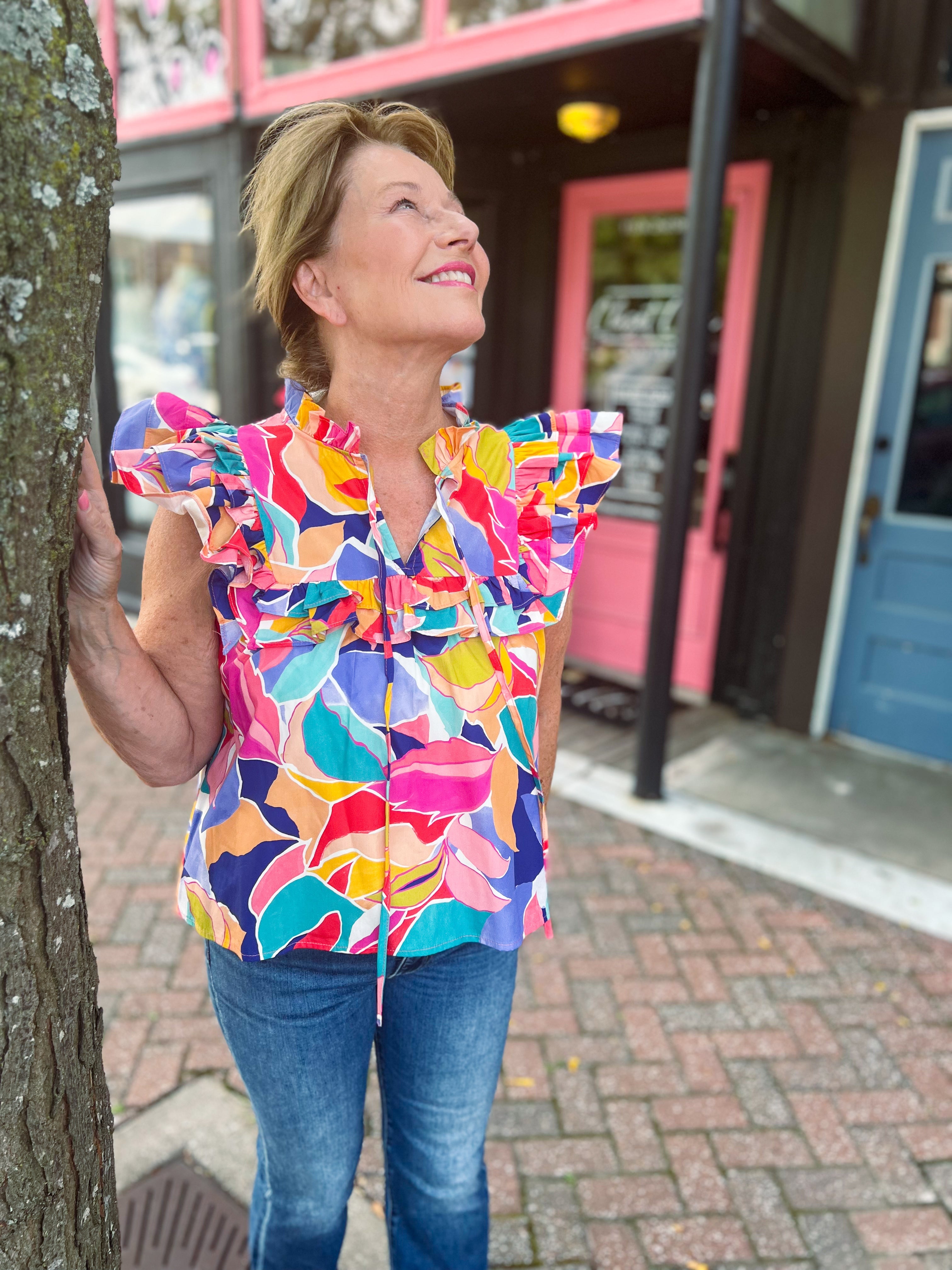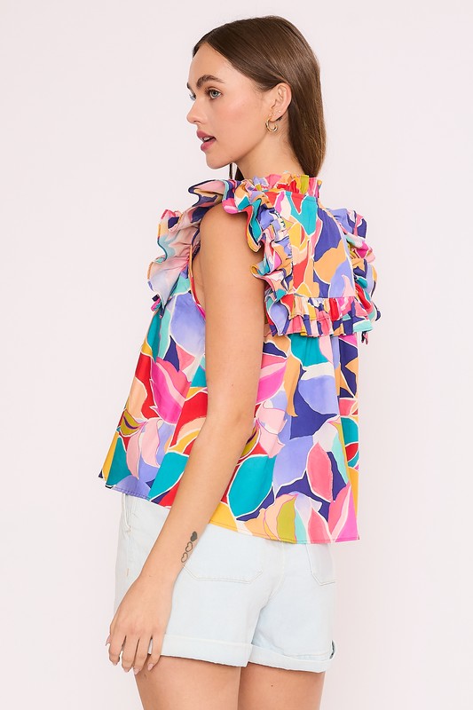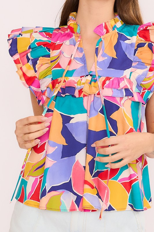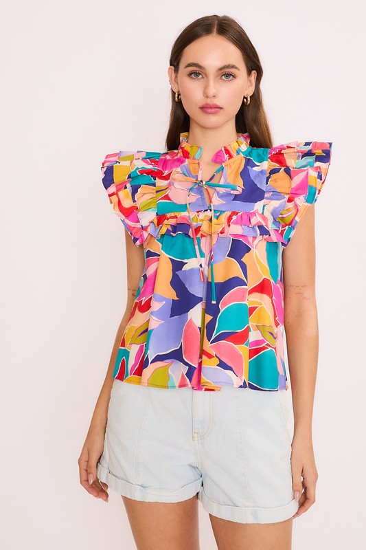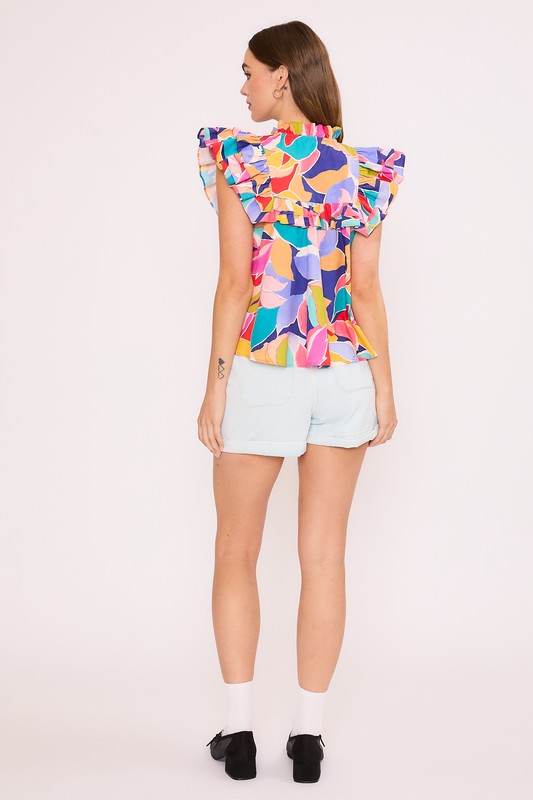 Get ready to make a statement in our Geo Floral Ruffle Bib Top! This playful top features ruffled cap sleeves and a bib design in a trendy geo floral pattern. Perfect for adding a touch of unique style to any outfit, while still staying comfortable with the short sleeves. Stand out from the crowd with this fun and quirky top!