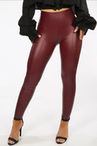 "Conquer the day with our GIGI HIGH WAISTED LEGGINGS. The faux leather finish fabric adds a bold touch, while the sleek fitted design shapes and flatters. Stay comfortable and confident with the high waist pattern. Made with 10% Polyurethane, 75% Polyamide, and 15% Elastane in timeless red. Take on any challenge in style!"
