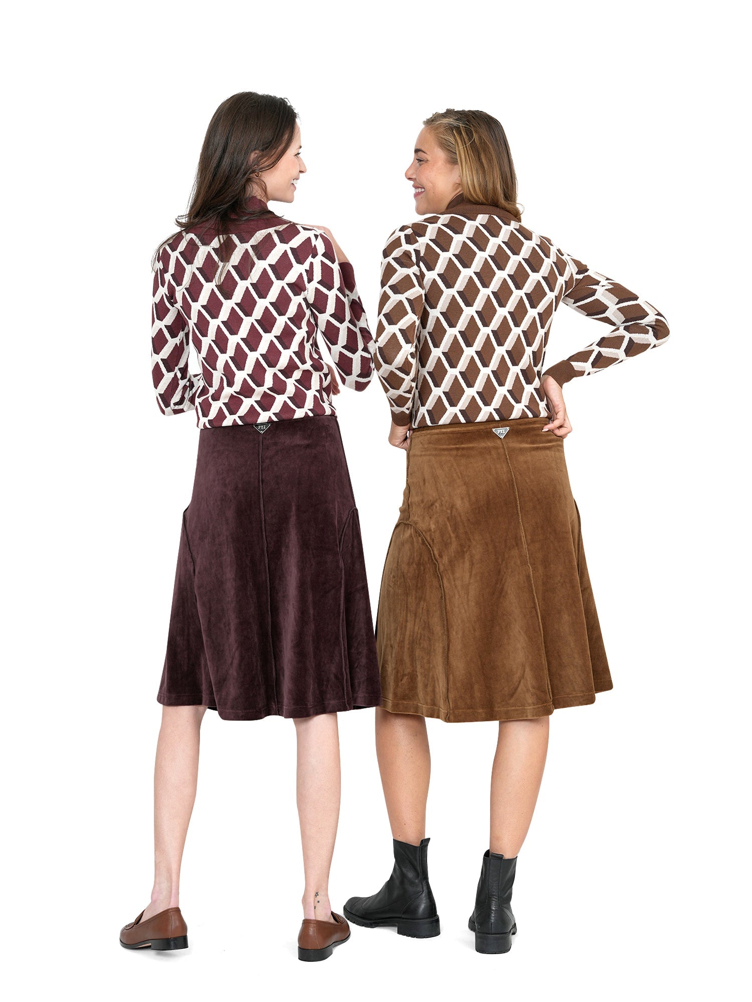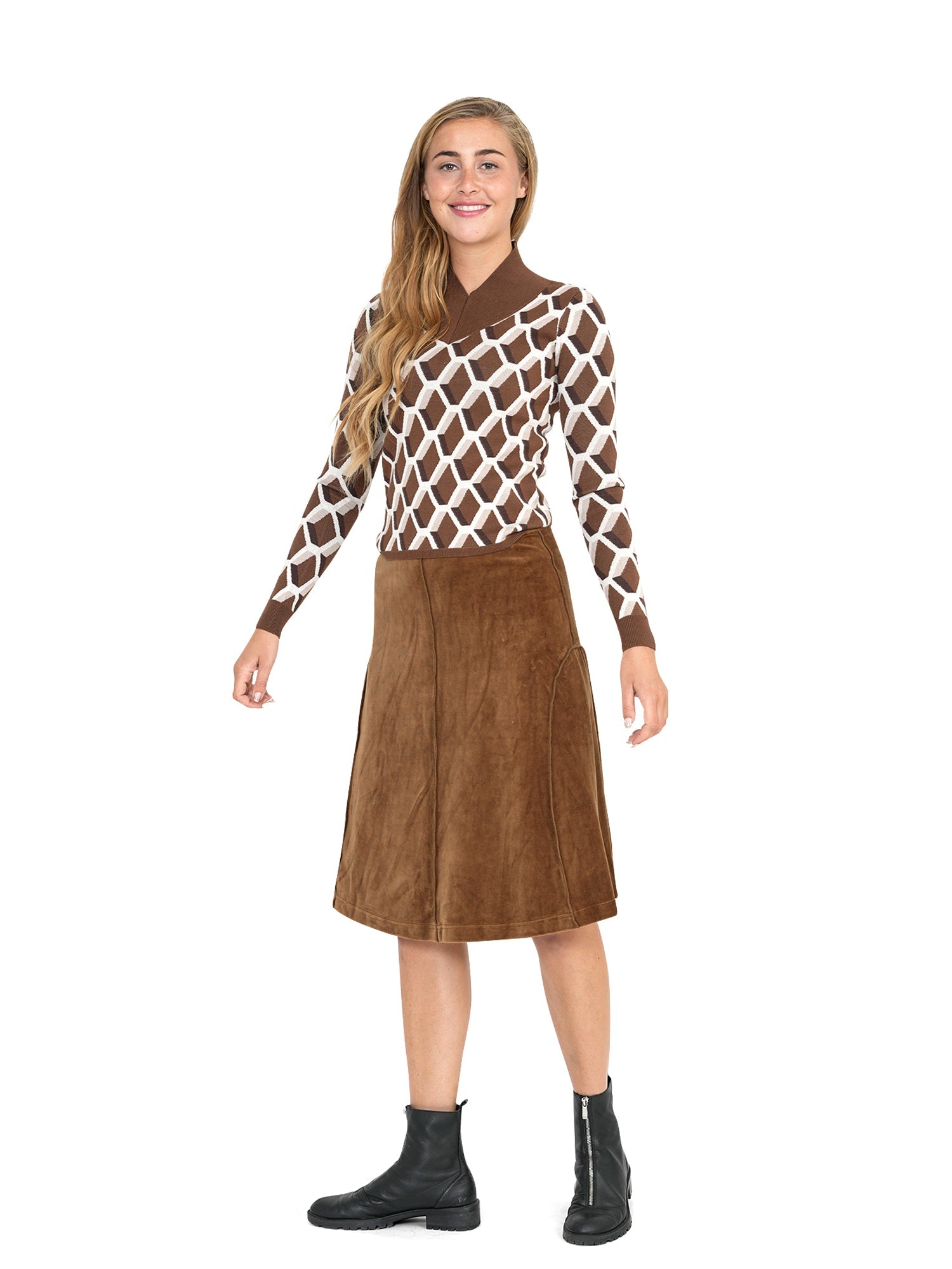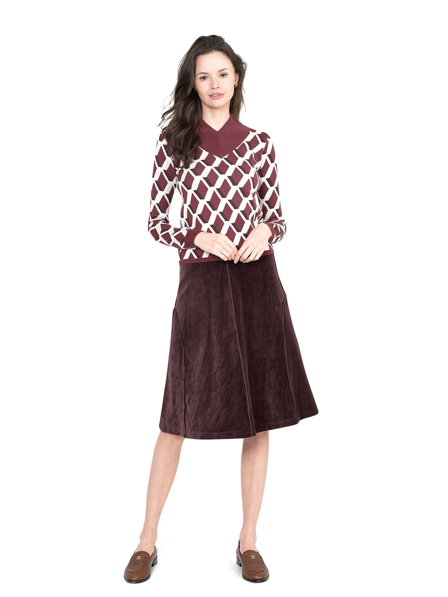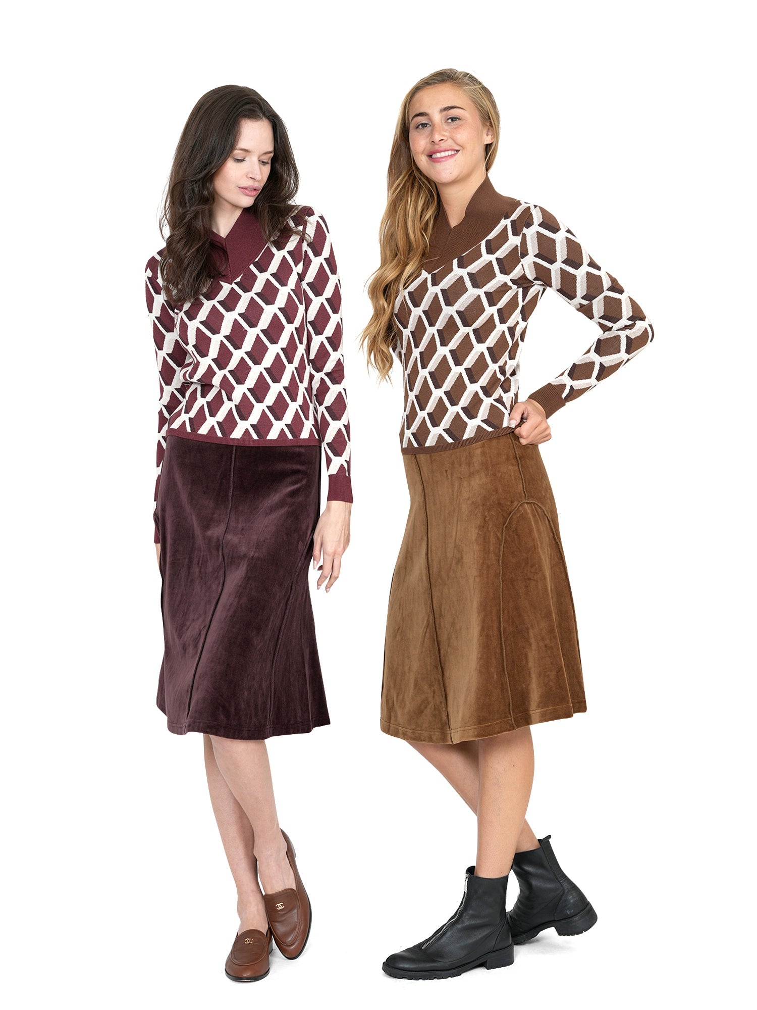 •LOOK: This beautiful graphic designed sweater has a lot of panache . Bold wide neck v adds extra interest. Can be worn with jean bottoms or something black or grey.