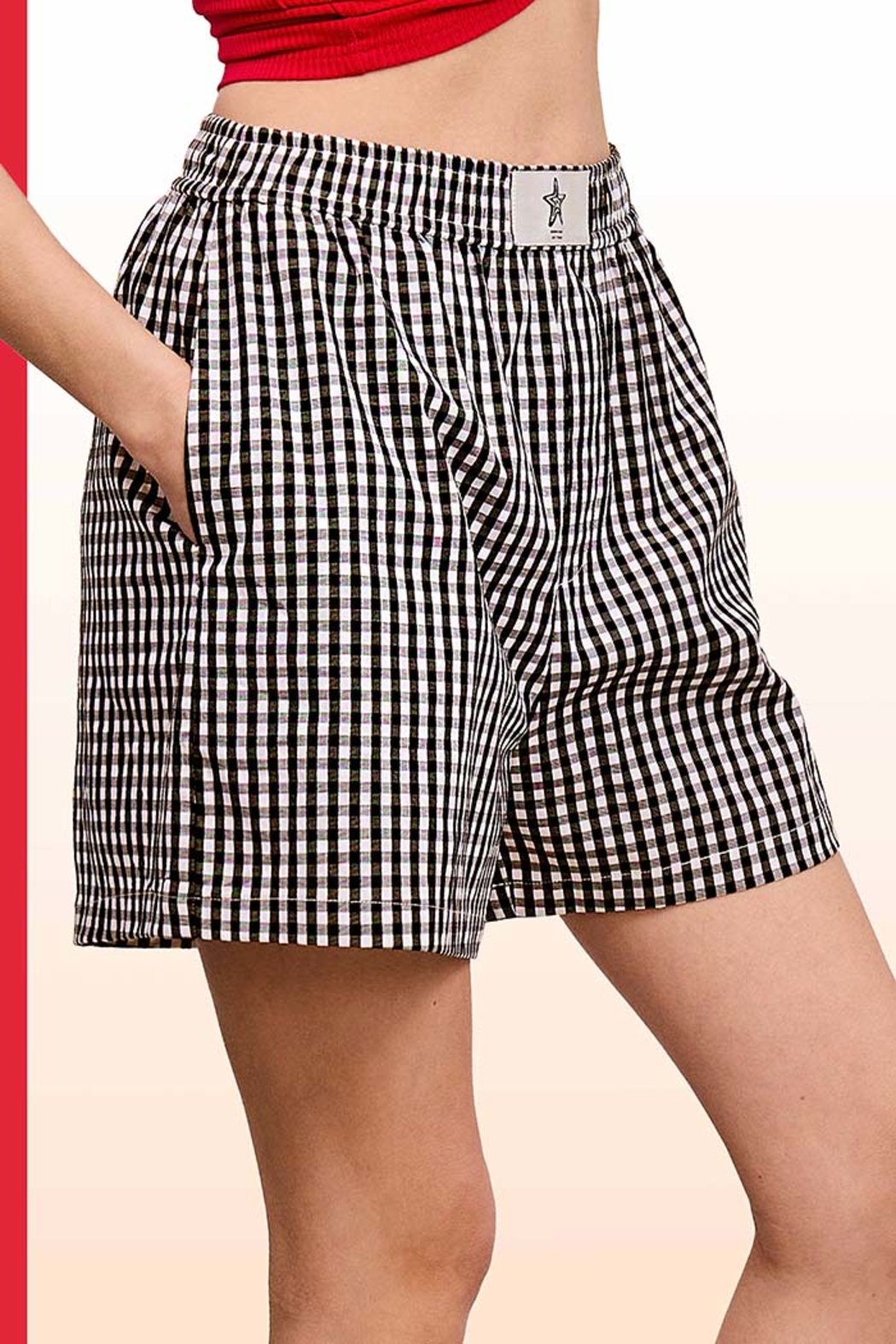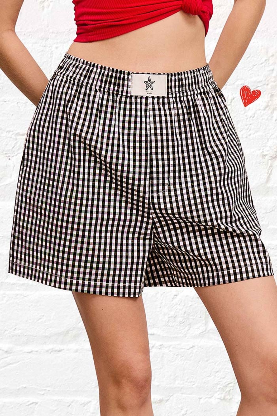 These gingham shorts feature a classic checkered pattern, perfect for a cute and casual look. Designed with an elastic waistband for comfort, they also have a stylish patch with a star detail at the front. The relaxed fit and lightweight fabric make them ideal for warm weather, while the side pockets add a practical touch. A subtle side slit enhances mobility and adds a stylish flair. Pair them with a crop top or a tucked-in tee for an effortlessly chic outfit!