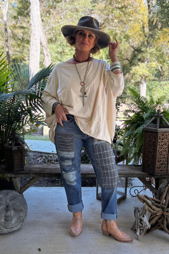 Add a touch of whimsy to your wardrobe with Ginsey Stitched in Dreams Jeans! The relaxed fit waist and back elastic provide comfort, while the 3 button notches add a unique detail. The patchwork patches and rudimentary stitching create a one-of-a-kind look. Tapering legs give a flattering silhouette. (Dreamy style for the playful and fashion-forward!)