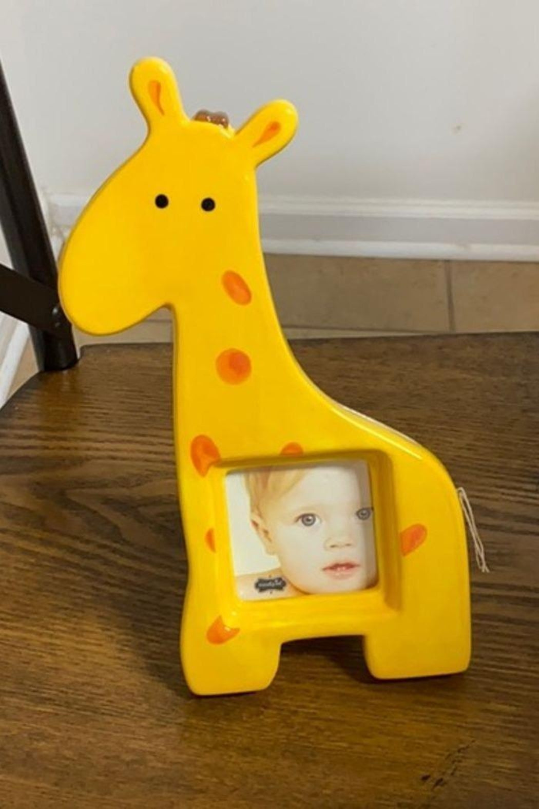Adorable, table-top giraffe shaped picture frame to capture any treasured moment with the little ones. Ceramic body and easy to open picture window. Hazard free glass cover. Glazed in a bright yellow and finished with a cute string tail. Window fits a 3"x3" photograph. Frame is 11" tall and 5" wide.
