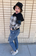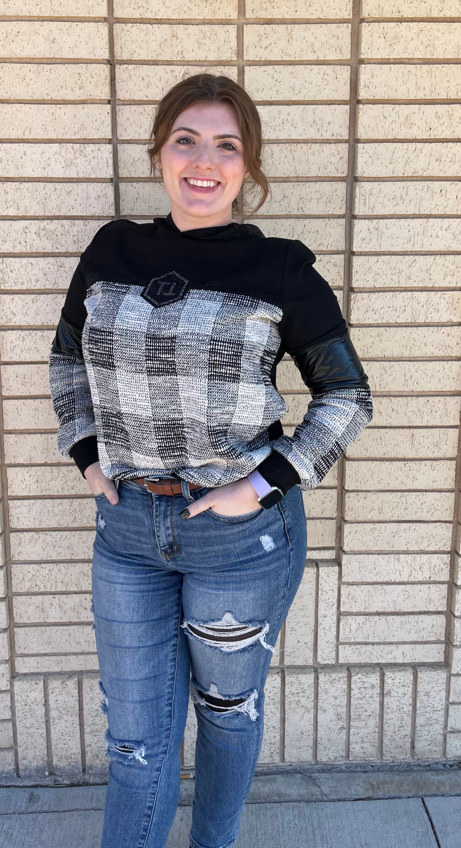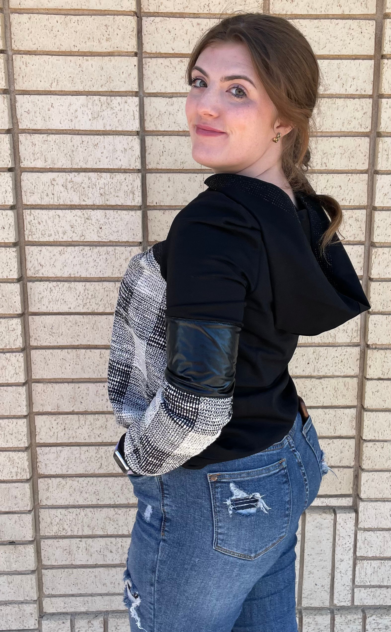 Cute boucle knit body with black rhinestones and faux leather on the sleeves, and a striped bottom stretchy hem, this hoodie pullover is what haute couture is all about!