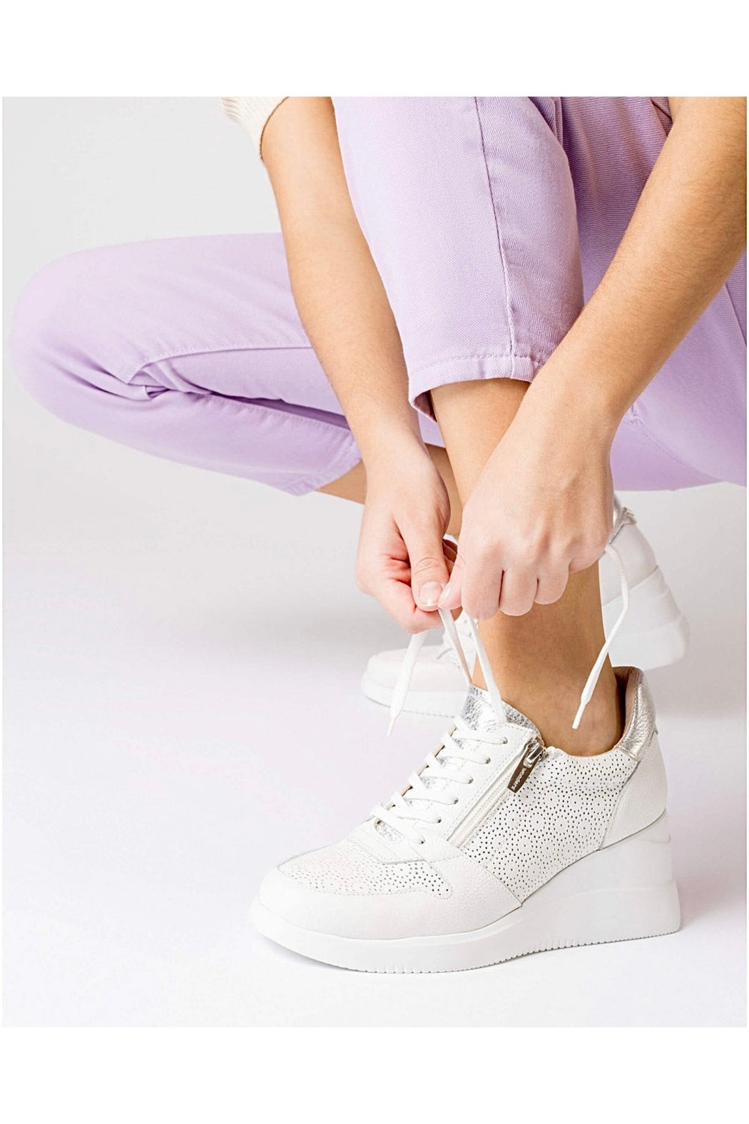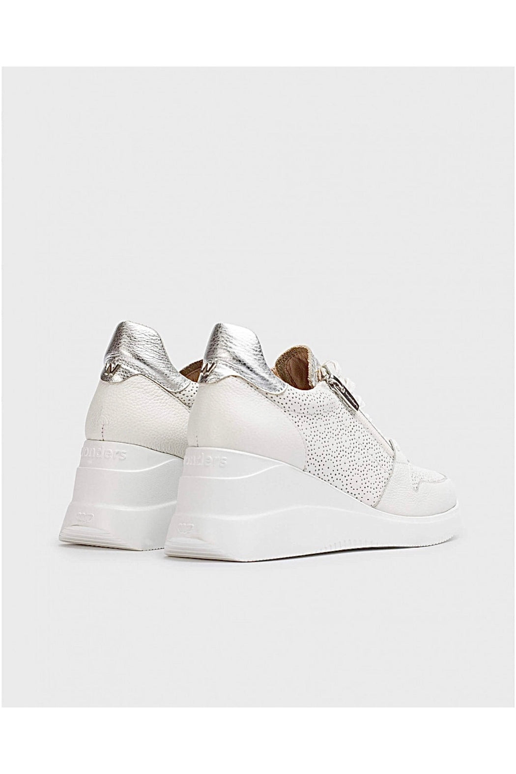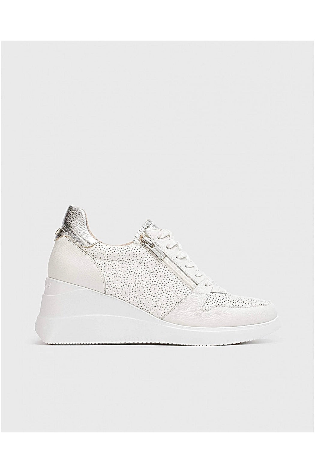 White leather wedge sneakers. This timeless trainer has a floral openwork detail, a zip on the instep and a lace-up closure. The raised wedge helps stylize the silhouette and the sole has been developed using WondersFly ™ technology, guaranteeing lightness and comfort. Get ready for the feeling, YES WE FLY.