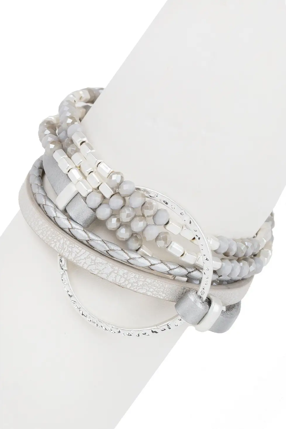 The Flow Bracelet is effortlessly beautiful, with strands of leather and shimmering beads. The center of it all is a metal circle lined with sparkling crystals. All these strands come together connected to a magnetic clasp, for easy on and off!