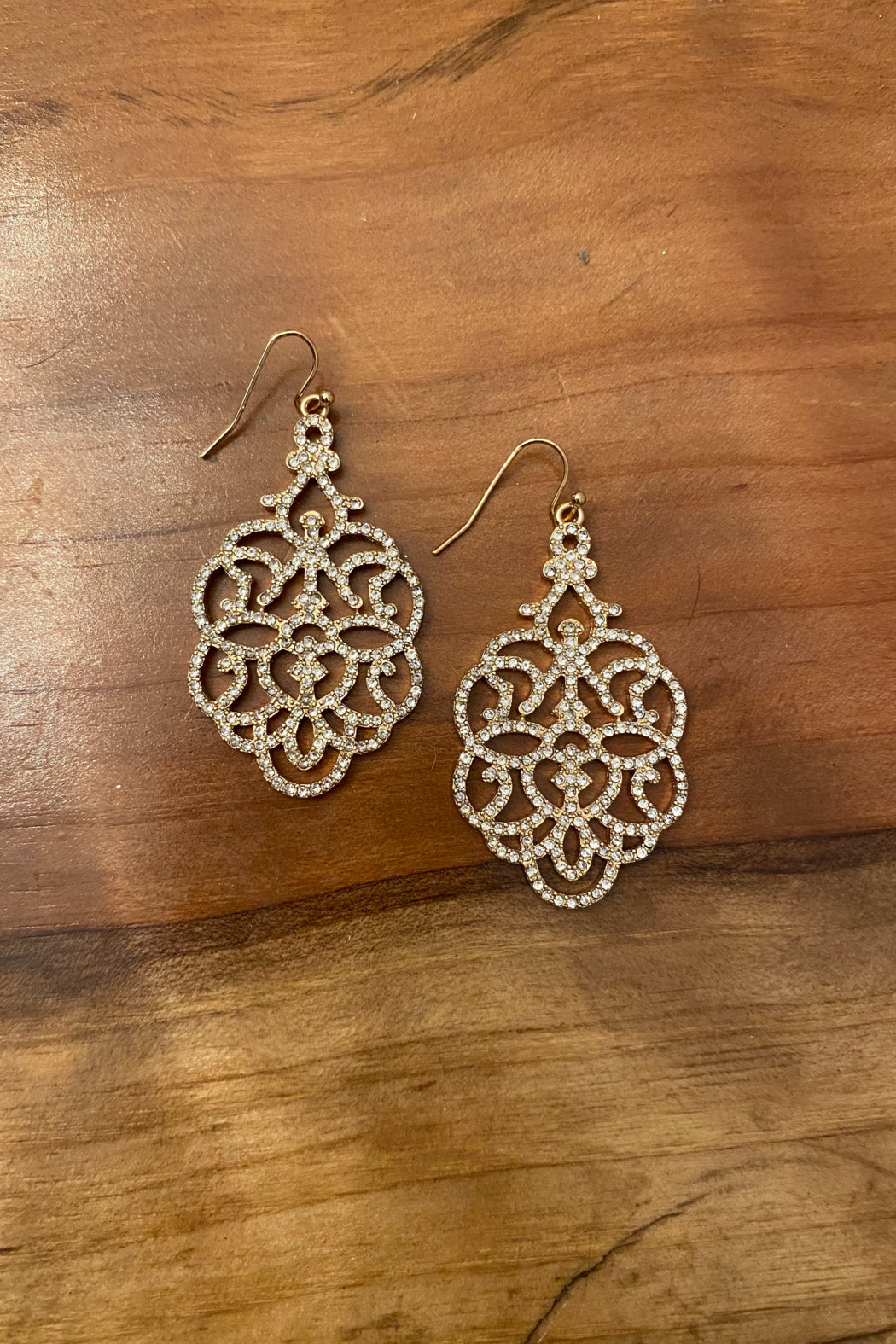 Gold diamond dangle earrings. Dress up any outfit with a dash of sparkle from these earrings.