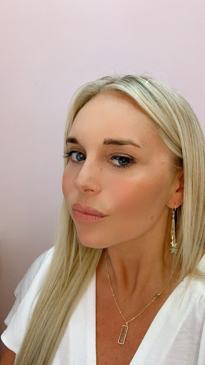 Gold chain necklace with gold pendant accented with labradorite beads.