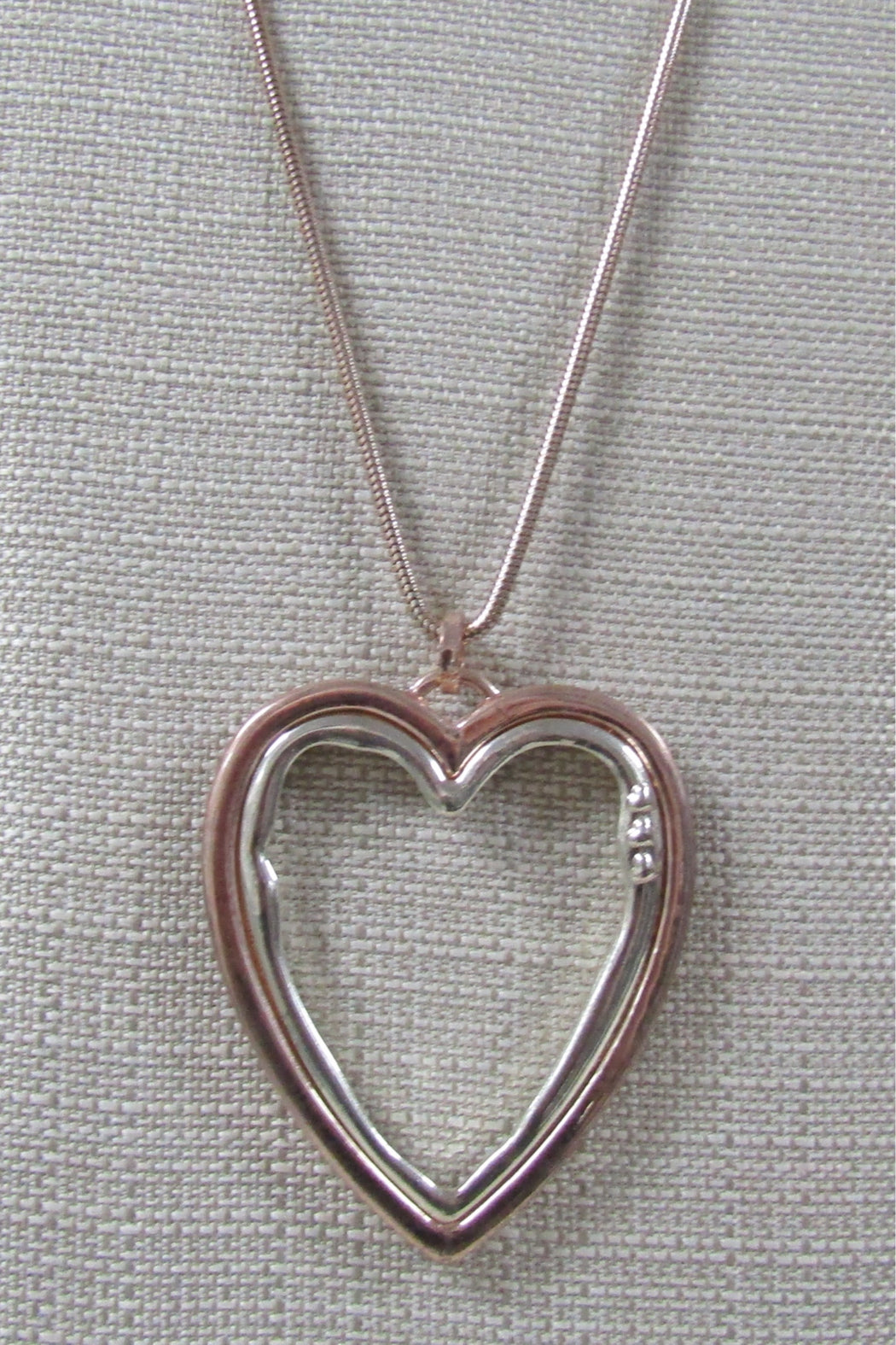 Open heart bordered with silver and gold. Long gold chain with lobster claw hook,