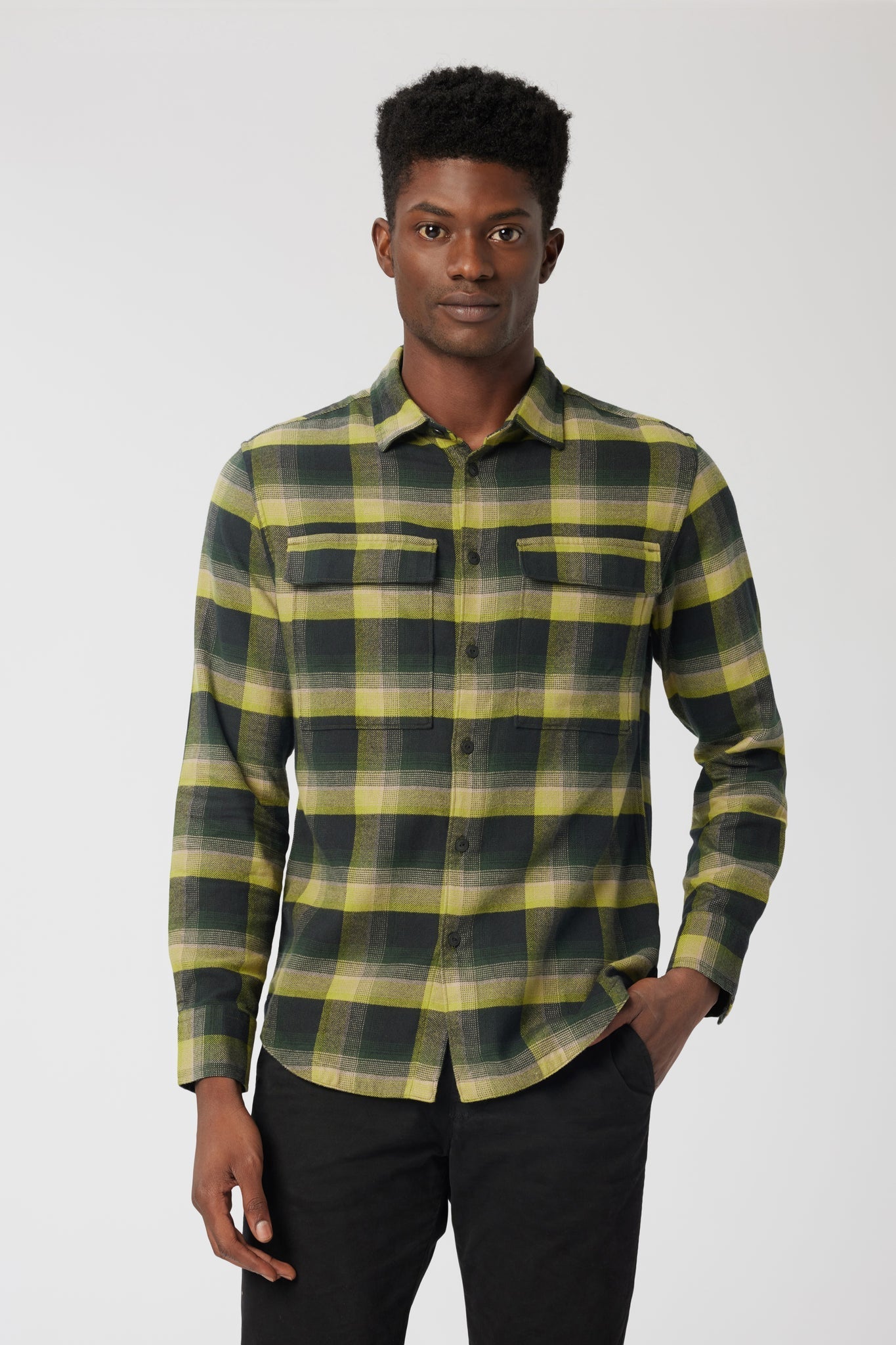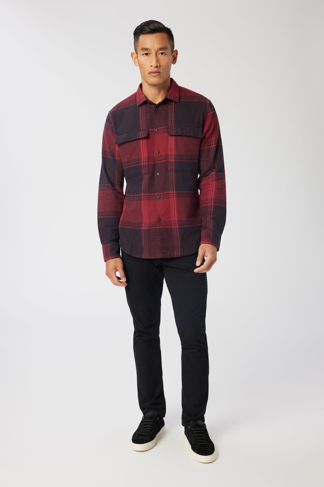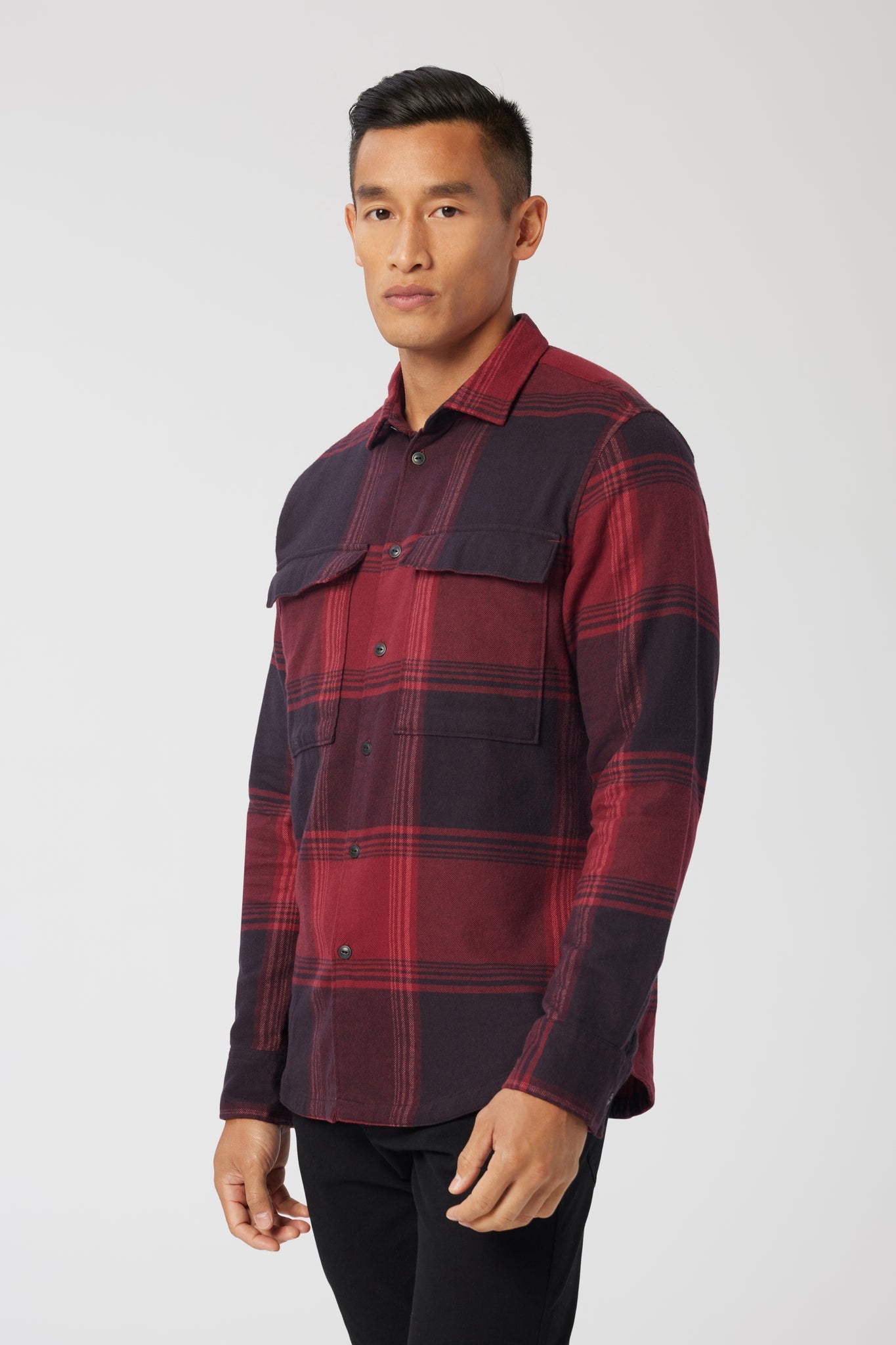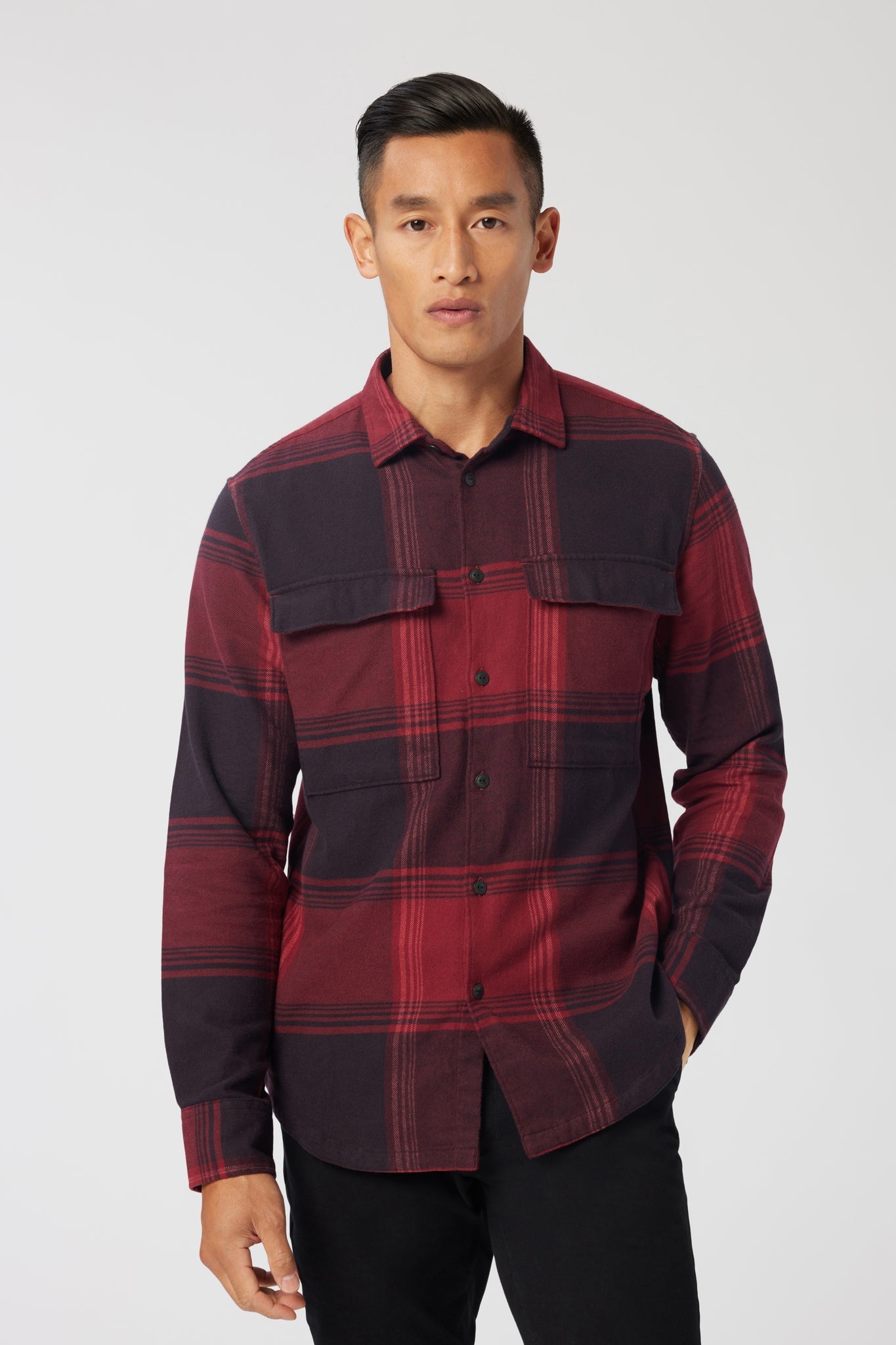 An oversized chest pocket adds a stylistic detail to timeless shirt jacket constructed in brushed flannel for ultimate comfort and versatility.