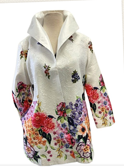 Embrace boldness with our Floral Print Jacket. This swing style white jacket features a captivating floral print. Make a statement and stand out from the crowd with this adventurous addition to your wardrobe. Perfect for those who aren't afraid to take risks!