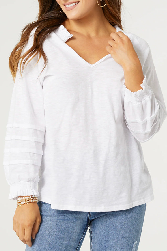 The Grace Long Sleeve Top is the perfect summer top, crafted from soft and lightweight slub knit fabric. Its puff sleeves are adorned with sporty stripes while the neck and sleeves feature charming ruffle trims. Stay stylish and comfortable all season long!