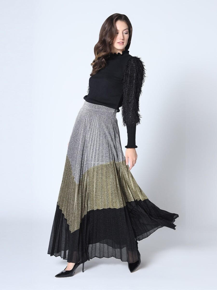Three Metallic Color Blocked Pleated Maxi Skirt - Gracia S23504
