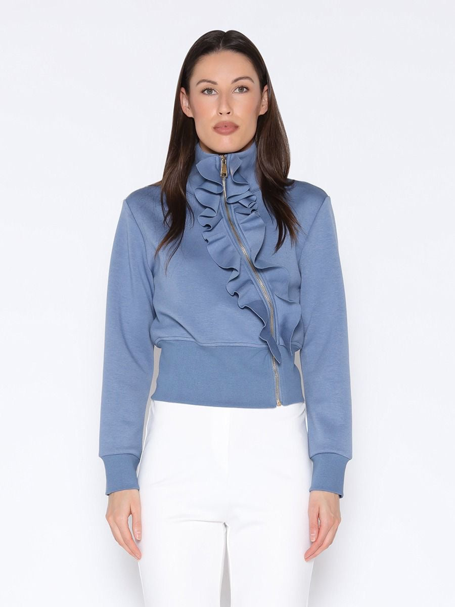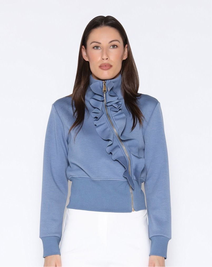 High neck Scuba Asymetrical Ruffled Zip Jacket - Gracia J25202