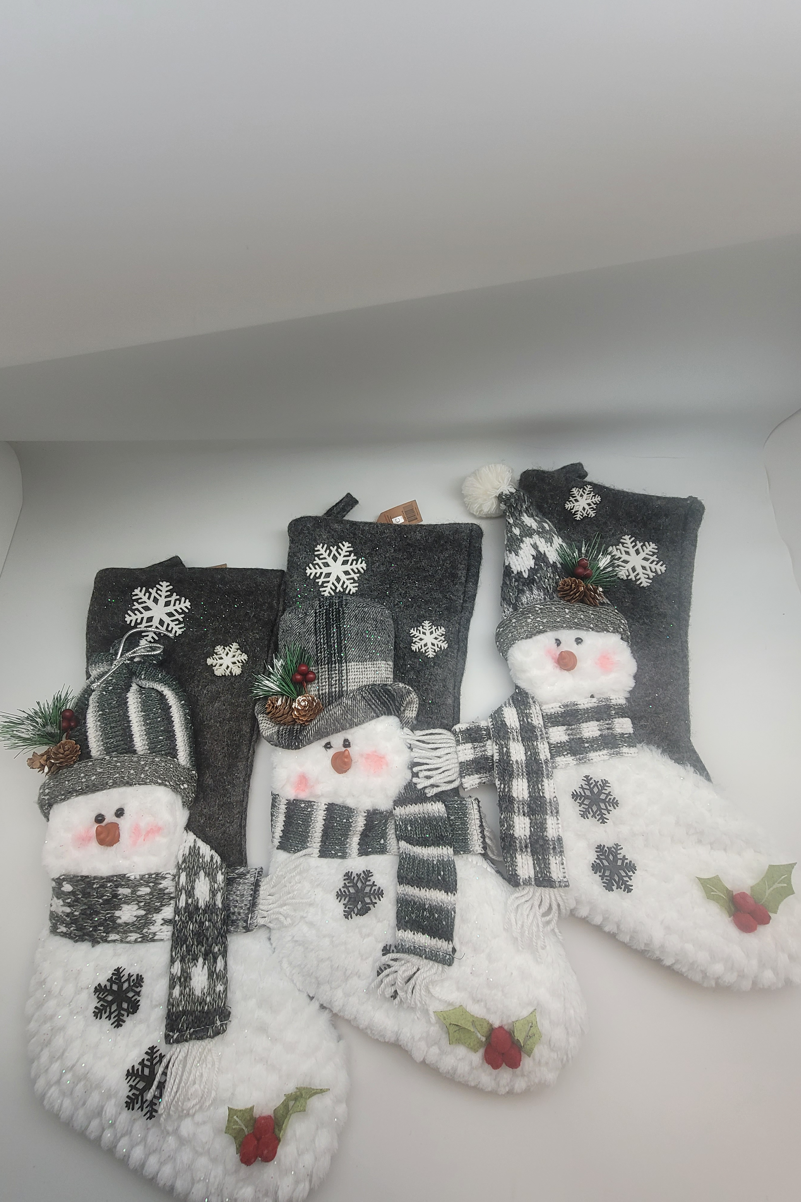 19"Gray snow man Christmas stocking plush snowmen all decked out for Christmas will be a delight to display in your home. Each stocking is 19-in long measured from cuff to toe, opening 7" 1/2 ", and each snowman features a warm scarf, winter hat and snowflakes falling lightly above their heads on a white and gray background. They will bring smiles to anyone's face! price is for 1
