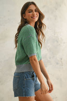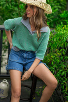 Introducing the Green Collared Knit Top—a chic and comfortable addition to your casual wardrobe. This textured polo sweater features a relaxed fit with half sleeves, complemented by a contrasting light blue collar and hem for a modern touch. Crafted from soft knit fabric, it offers both style and coziness, making it perfect for various occasions.
