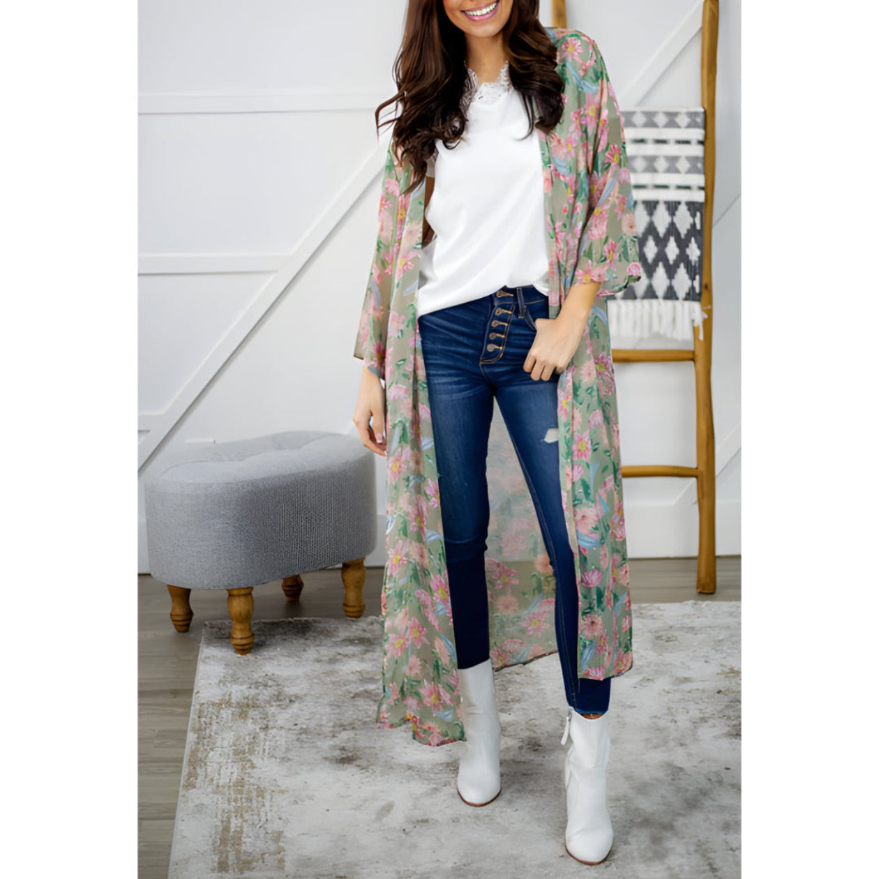 Unleash your inner Goddess and look great doing it in this light green floral print Kimono.