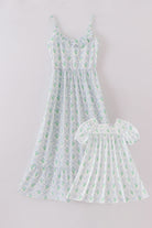 Match your mini with this adorable green leaf bow print dress for mom and daughter. Perfect for family photos, brunch dates, or just for fun. Get ready for twinning moments in this playful and stylish dress!