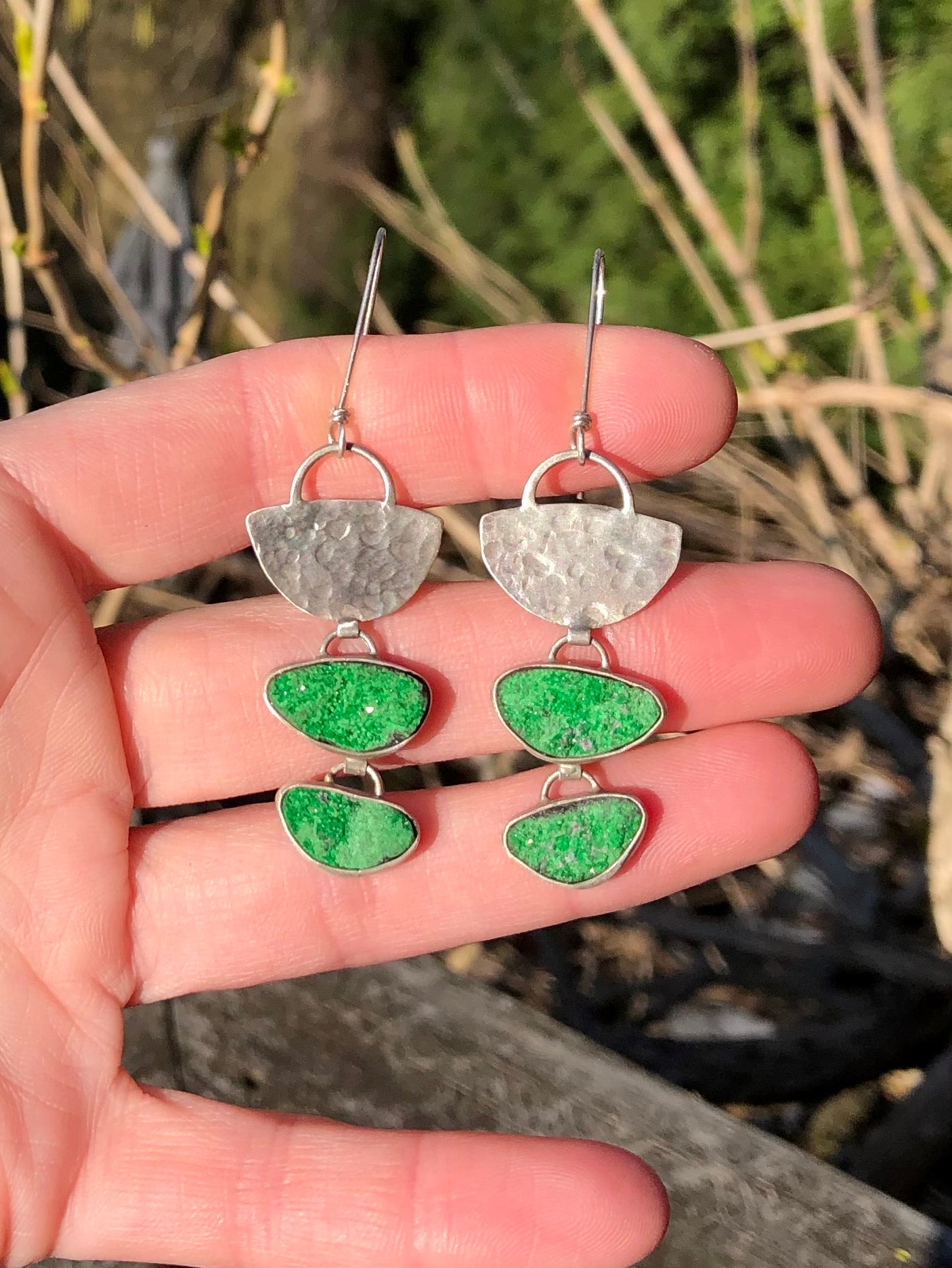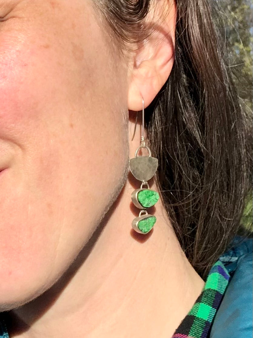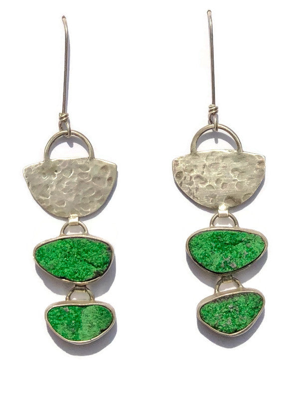 Four rare and brilliant uvarovite (green garnet druzy - a completely natural gem) are set in fine silver and accented with a hand-forged and hammered half moon shape. Approximately 2.5” in length.