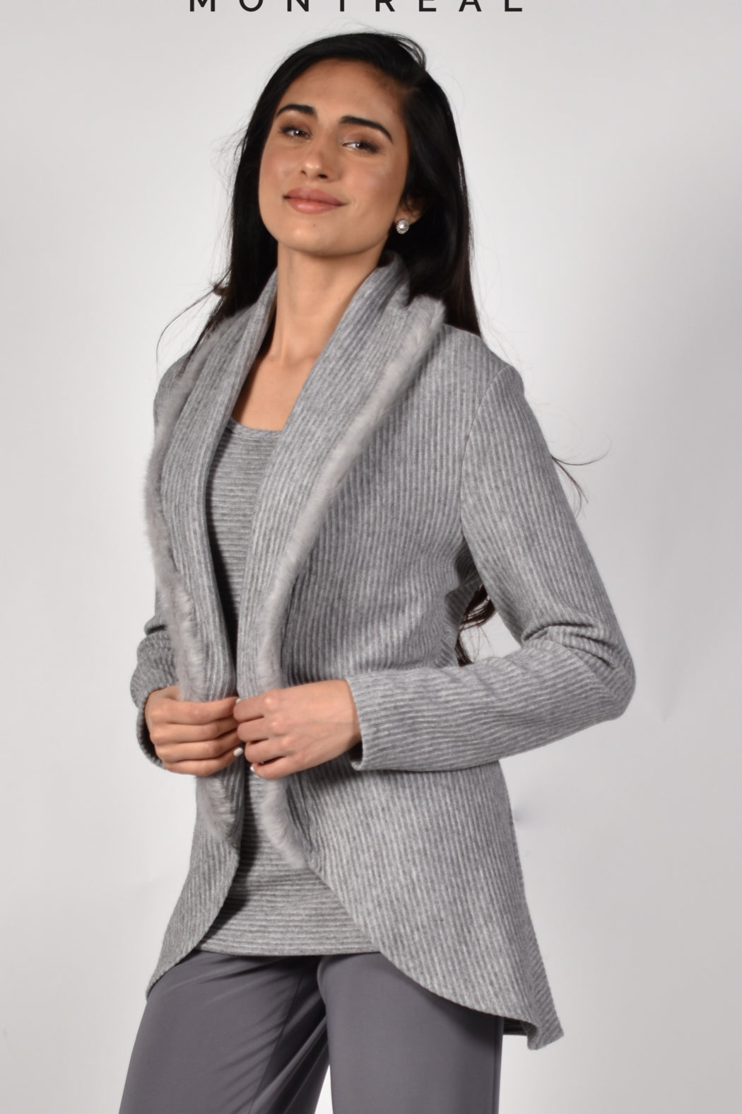 Grey Knit Cover=Up with Open Front and Faux Fur Piping. See matching Grey Knit Top (214478)