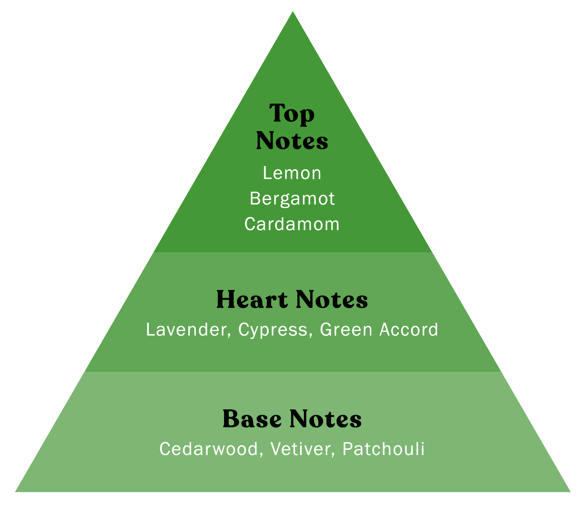 Top Notes: Lemon, Bergamot, CardamomHeart Notes: Lavender, Cypress, Green Accord