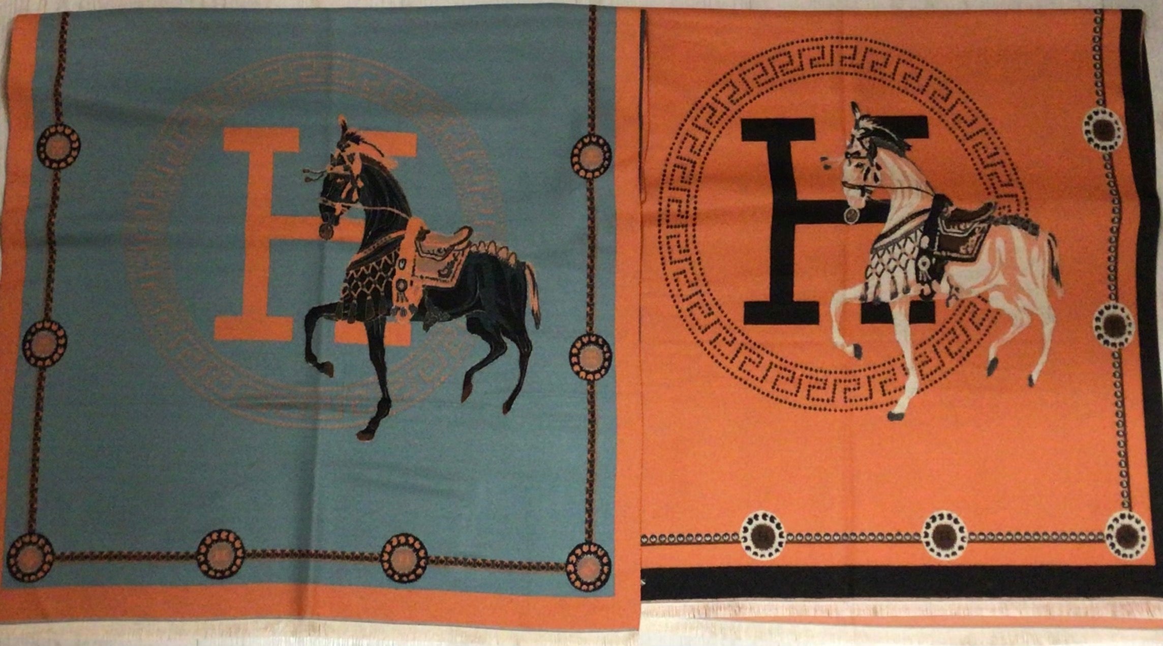 Oversized equestrian wrap with "H" horse. Fringe on ends.
