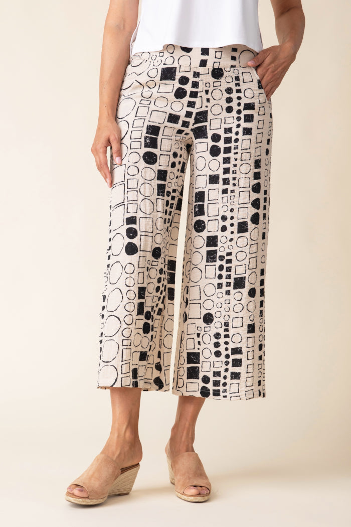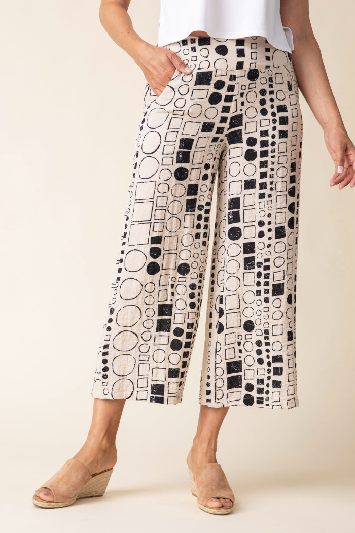 Add a playful touch to your wardrobe with these exclusive print pants, designed to pair effortlessly with your favorite black or white tees. Just slip on a pair of black sandals, and you're ready to go. Made from a lightweight rayon and nylon blend with a subtle crinkle texture, these pants are perfect for vacations or days on the go. Plus, with convenient pockets and a comfortable elastic back waistband, style and function go hand in hand.