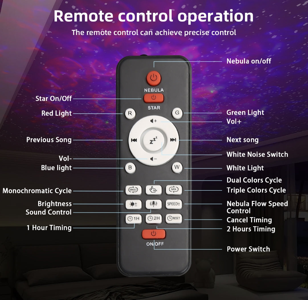 - Remote Control & Auto-off Timer: Along with the 4-in-1 star projector galaxy light, you also get a remote control that allows you to adjust the color lighting, projection mode, brightness, speed, music selection, volume, and timer. The auto-off timer can be set for either 1 or 2 hours, and if you forget to set it, the device will automatically power off after 4 hours. The remote control and auto timer are easy to use, providing flexibility when setting a timer to turn off at a specific time