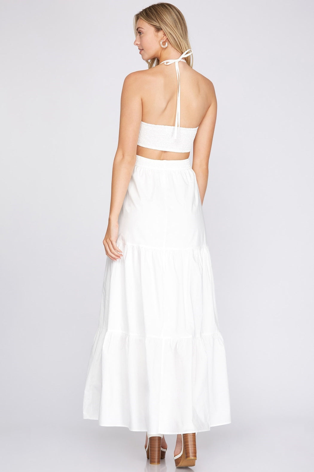 This halter poplin maxi dress with cross waist smocking detail is such a fun dress to wear for any event you may have coming up from graduation to bridal shower to rehearsal dinner to just wear for a sun dress. The model in 5'10 for length reference. It has the very popular tiered effect on the skirt and the smocking around the waist gives the illusion of a smaller waist.