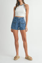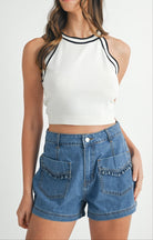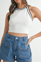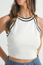 Keep it effortlessly cool with our Halter Neck Contrast Knit Crop Top. Designed with a sporty high neckline and bold black trim, this fitted sleeveless top adds a crisp, athletic edge to your everyday look. The soft, stretchy knit offers all-day comfort while the cropped hem makes it perfect for pairing with high-waisted jeans, skirts, or shorts. Style it with a cap and sneakers for a fresh, casual vibe.