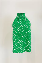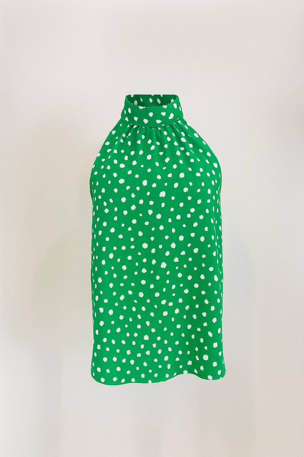 Turn heads in this chic and vibrant sleeveless top featuring a high neckline and bold allover abstract print. Designed in a playful Kelly Green with soft white accents, this lightweight piece is both eye-catching and flattering. The gathered neckline creates a soft drape, adding movement and ease to your everyday styling. Whether you're headed to brunch, the office, or a weekend getaway, this top is your go-to for effortless polish and comfort.