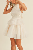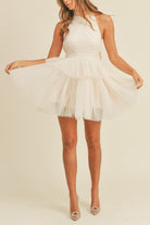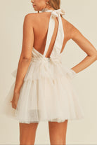 Unleash your playful side with our Halter Neck Tulle Mini Dress! Made with tulle mesh and featuring a halter neckline, this dress is perfect for any occasion. The ruffle tier detail adds a touch of whimsy, while the long back self tie adds a unique twist. And with a lining included, you can dance the night away in comfort.