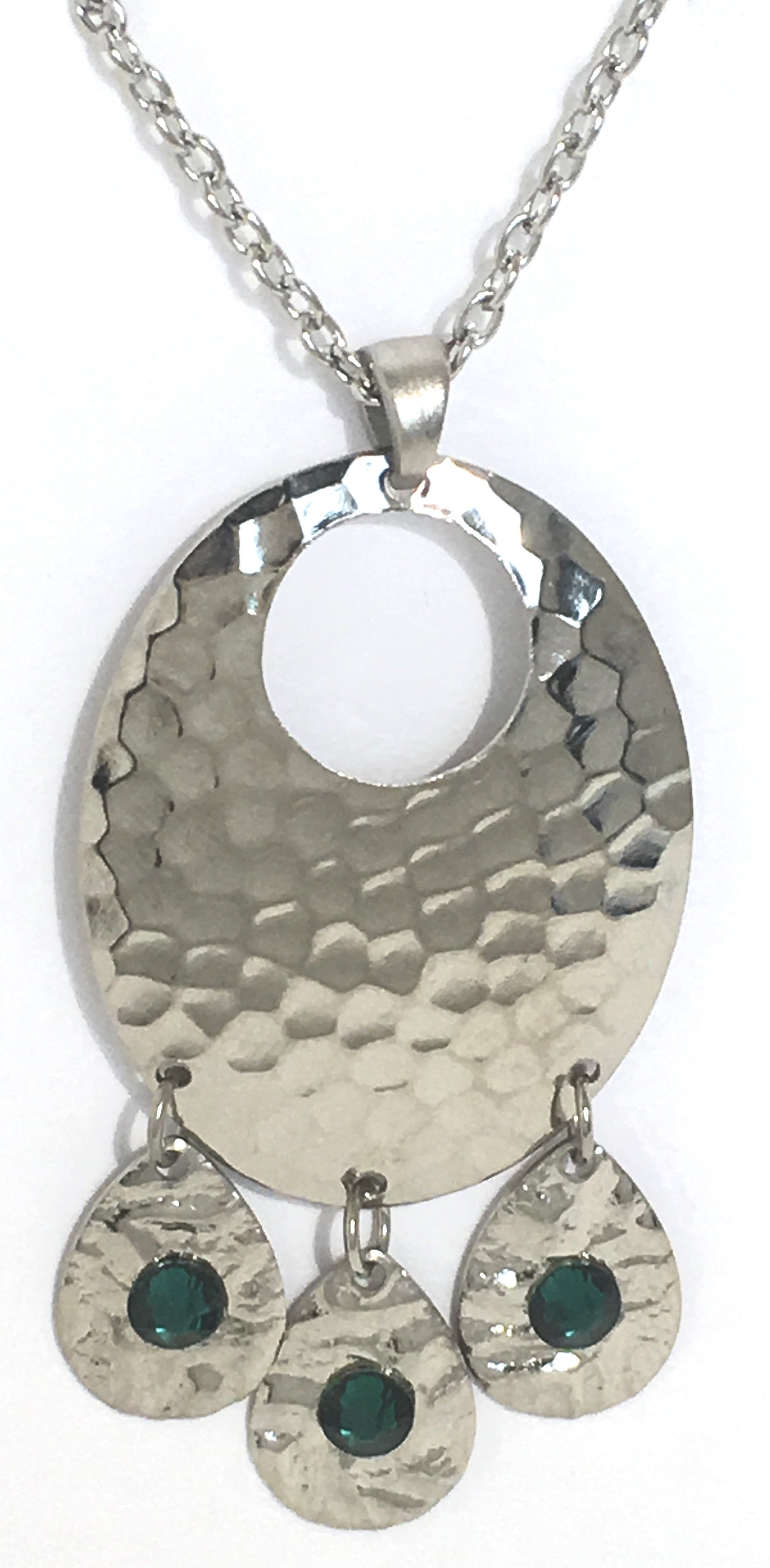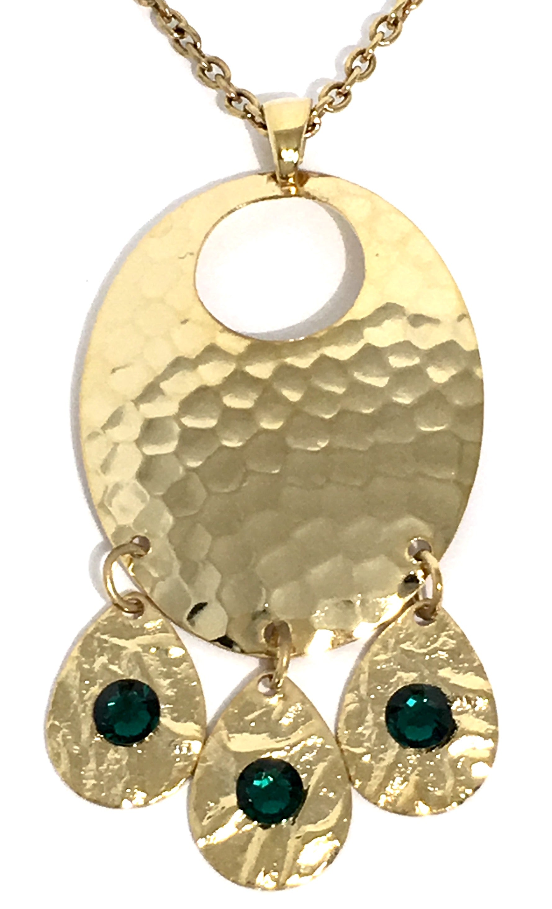 This elegant, hammered metal and emerald crystal chandelier necklace features light-weight metal in a chandelier-style design. Rich CZ gemstones add the perfect finishing touches. The perfect modern accessory for any outfit.