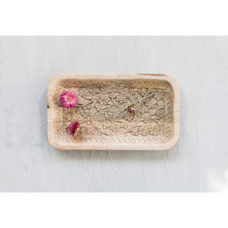 The inside of this handcarved mango wood tray is full of floral designs. Place it on a table or stand it up against the wall of a shelf. A few simple dried botanicals or decorative objects can be scattered inside making sure not to completely cover the decorative carvings. It can also be used to serve mints or other items.