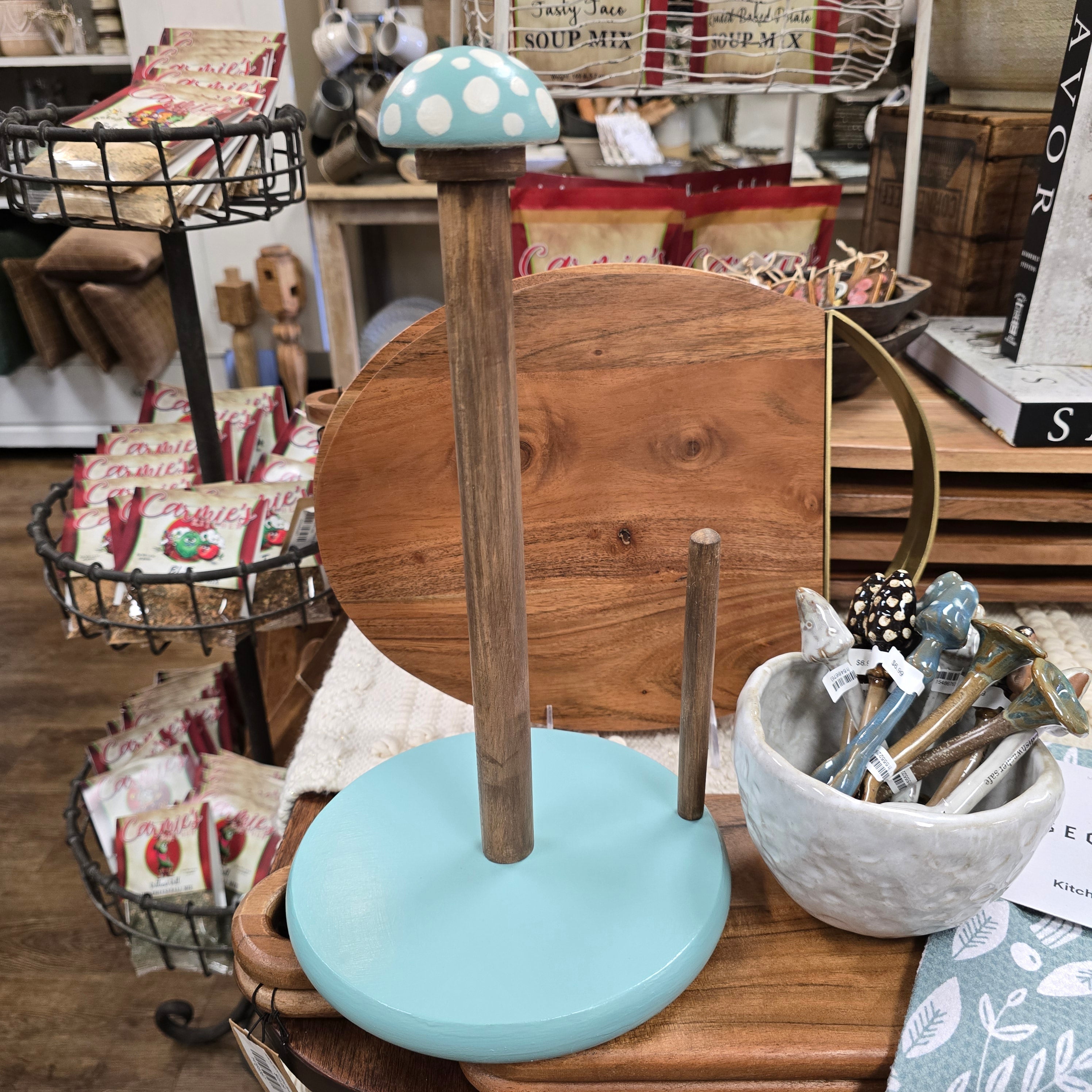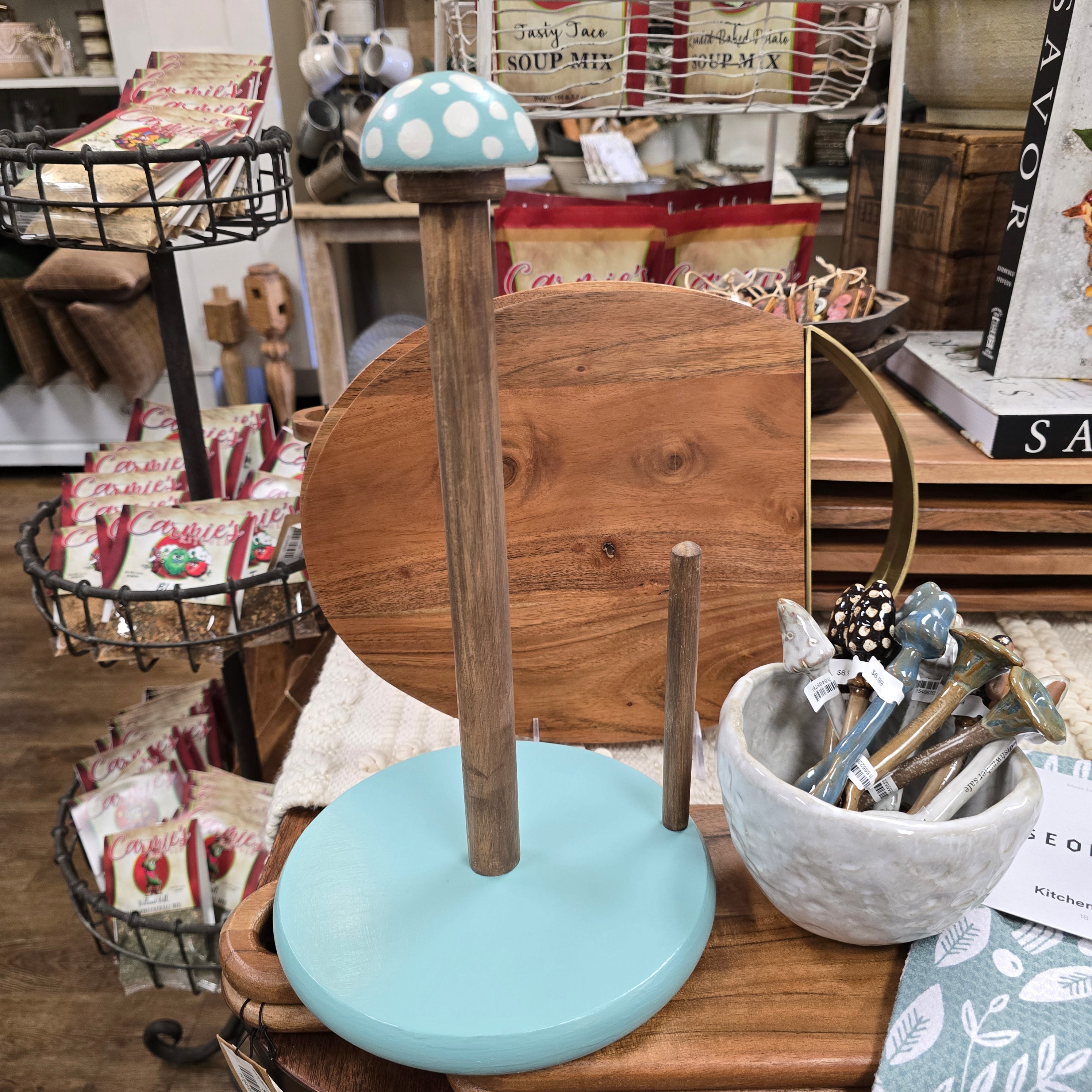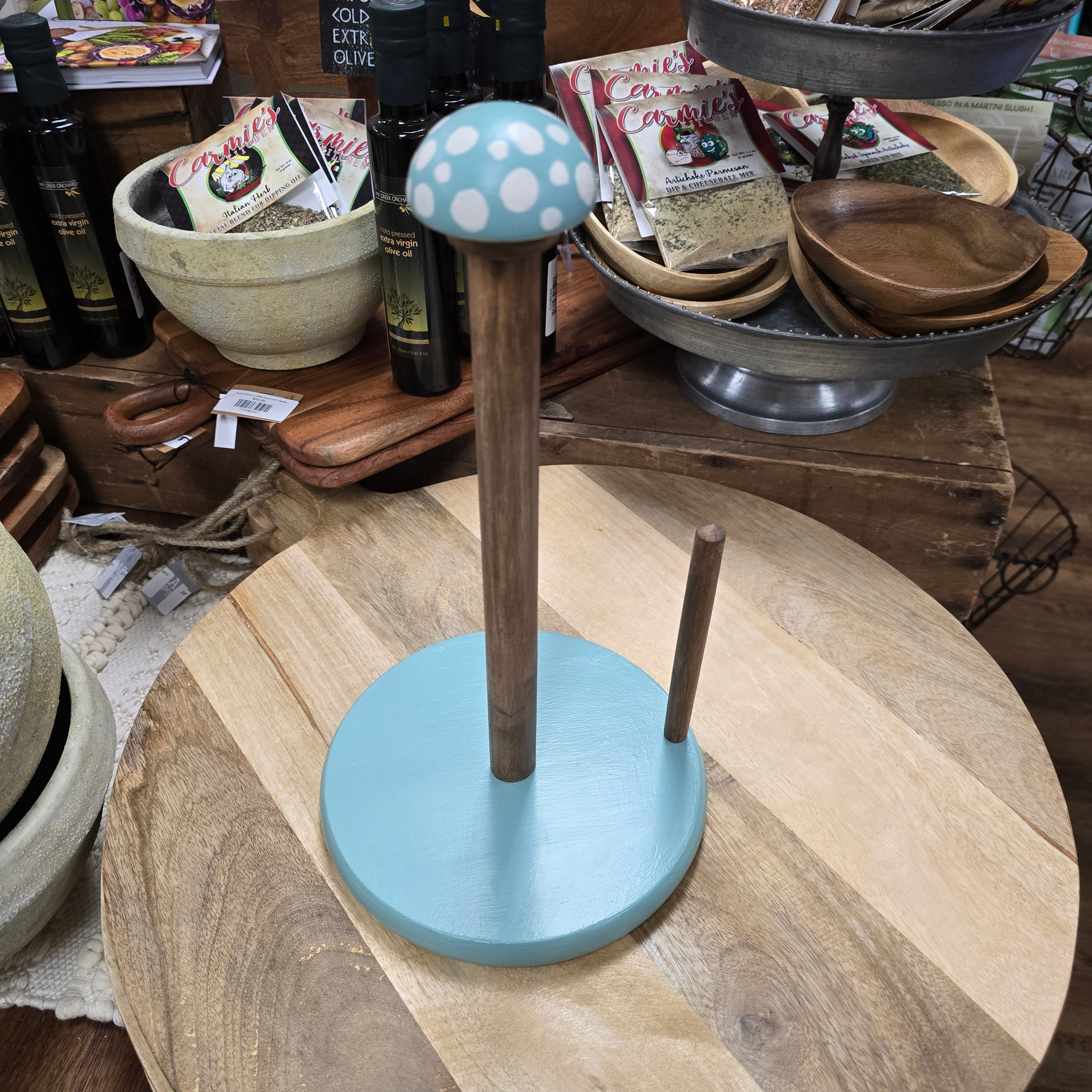 This paper towel holder features a charming hand-painted design, with the top depicting a delightful mushroom. Standing at a height of 13.5 inches and with a base width of 7.5 inches, it is both functional and visually appealing.