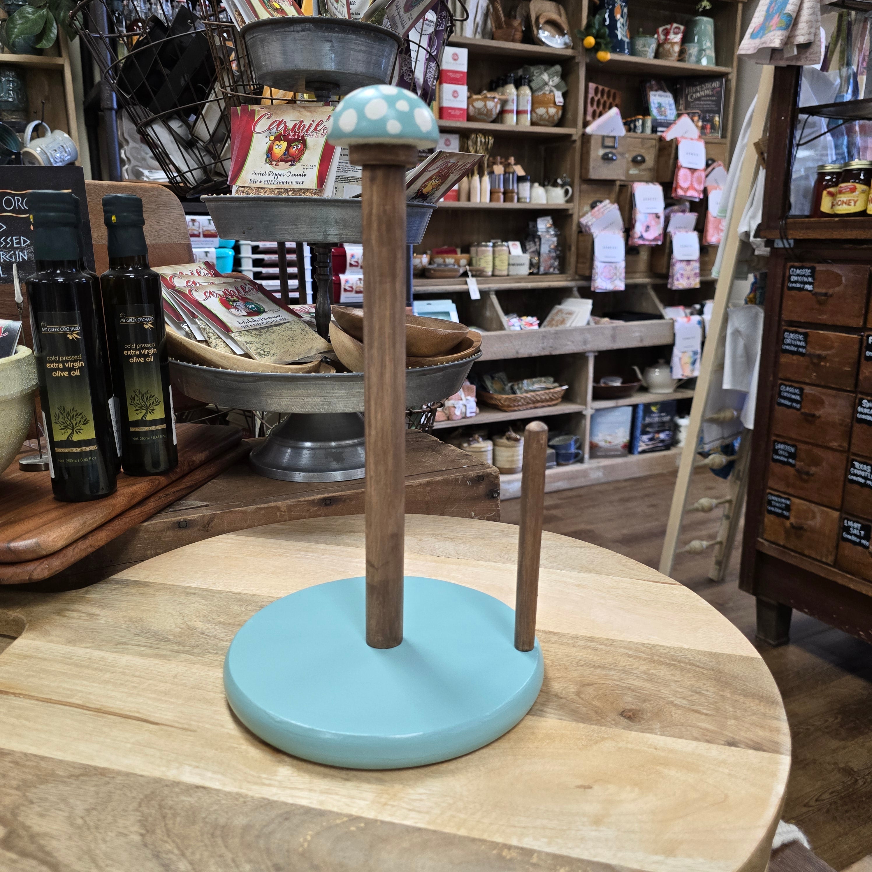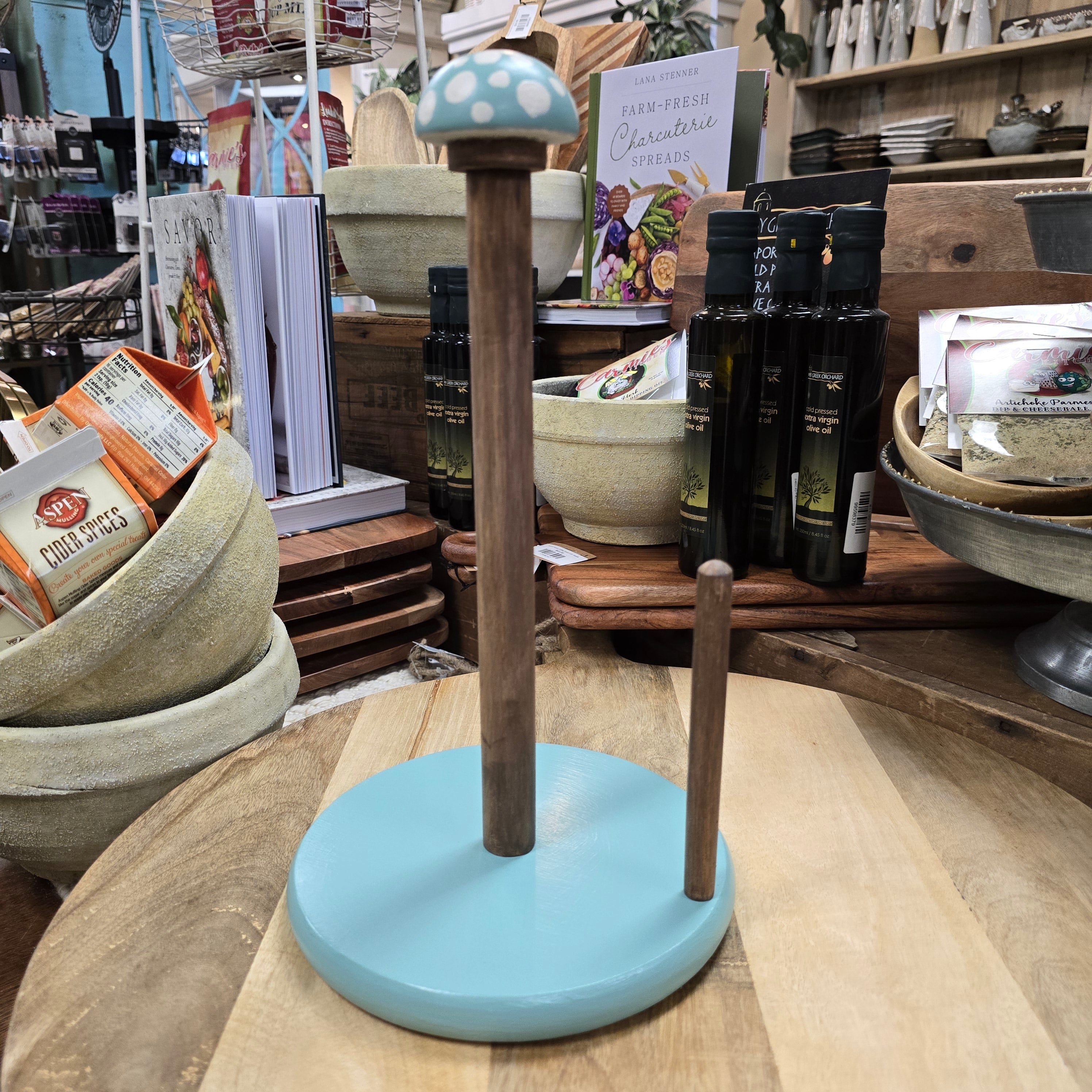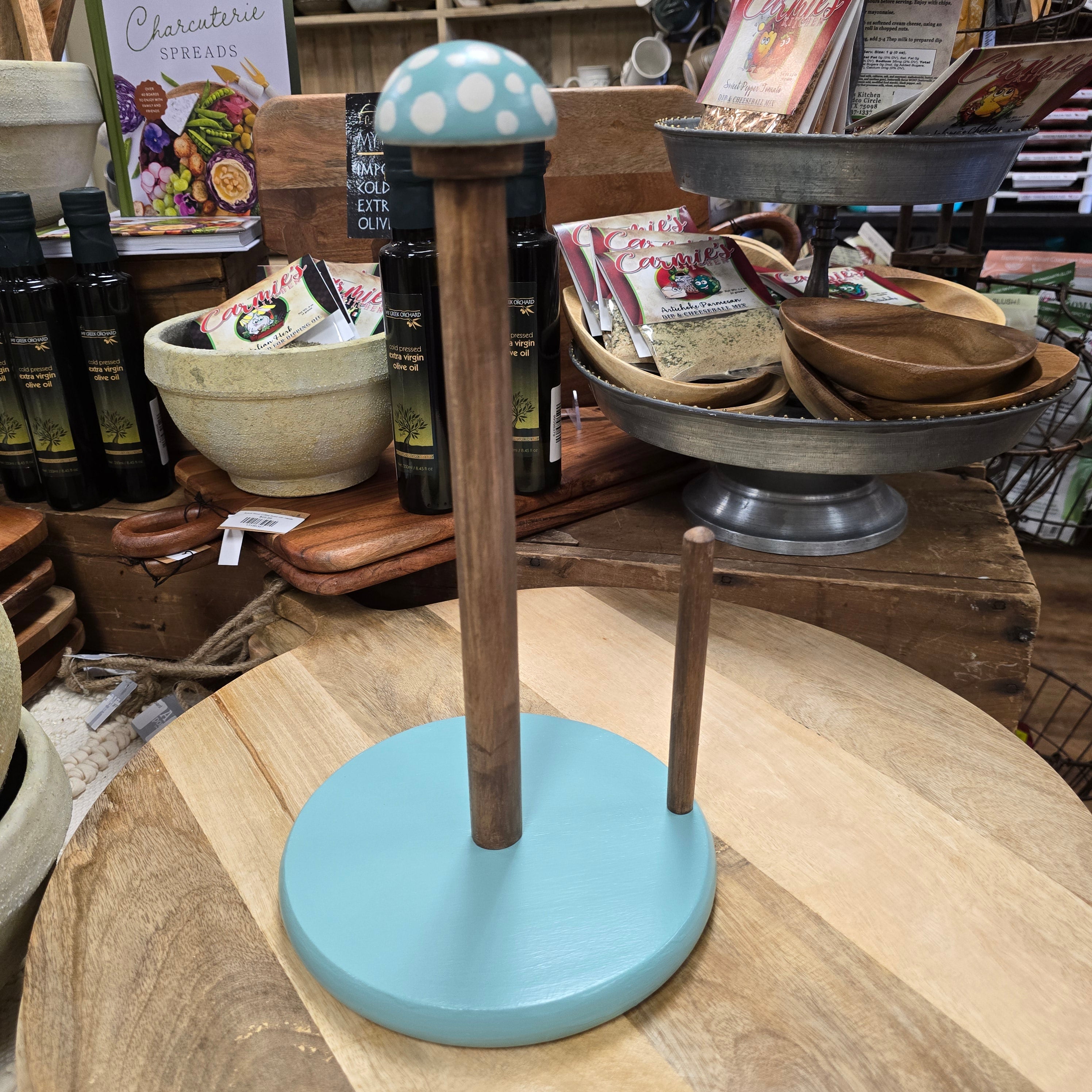 This paper towel holder features a charming hand-painted design, with the top depicting a delightful mushroom. Standing at a height of 13.5 inches and with a base width of 7.5 inches, it is both functional and visually appealing.