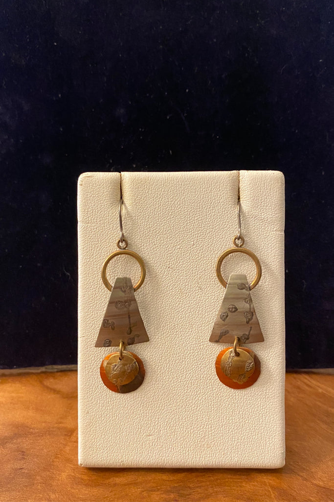 Handmade Mixed Metal Dangle Earrings. Material used are copper, brass aluminum.