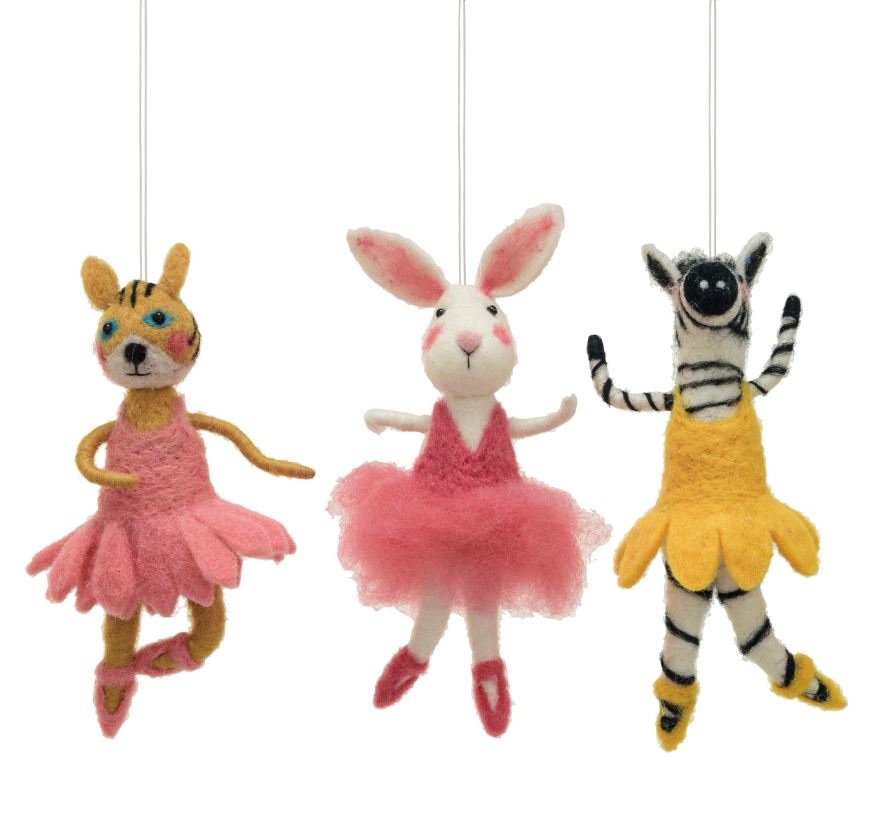 Add a touch of whimsy to your holiday decor with our Handmade Wool Felt Animal Ornaments. Each ornament is lovingly crafted from colorful felt and features charming ballerina designs. These one-of-a-kind ornaments are perfect for adding a playful and unique touch to your tree. Choose from 3 styles.