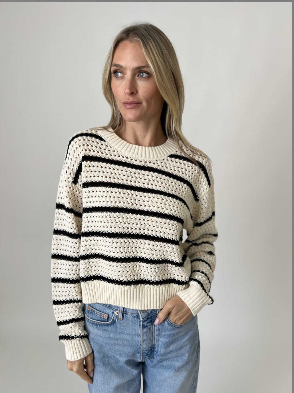 Get ready for Spring in this ultra-soft striped crochet sweater. It is the perfect for adding texture and style to your Spring wardrobe!
