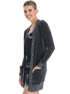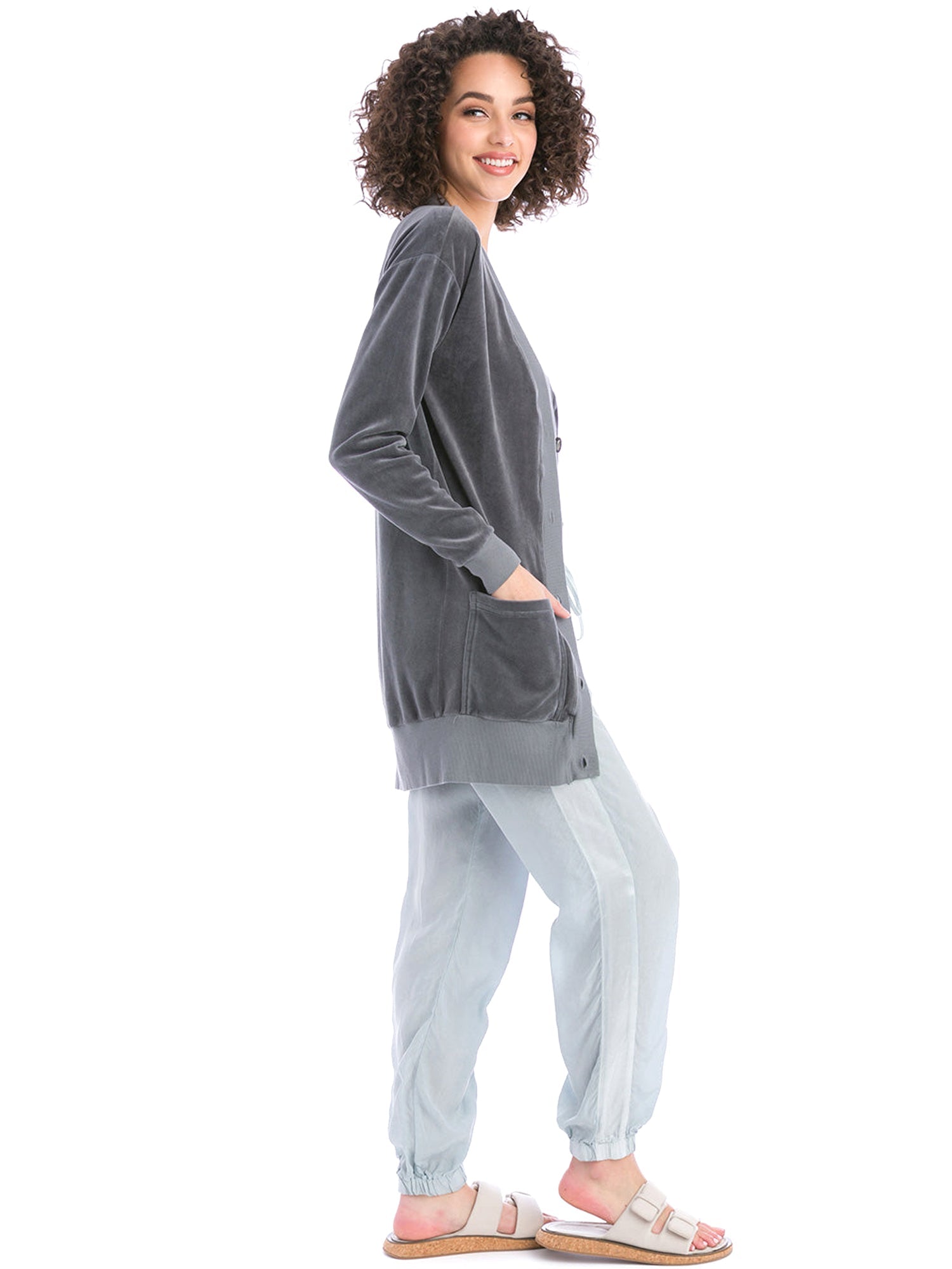 - Velour magic: Dive into the irresistibly soft touch of a cotton-blend velour that feels like your favorite plush blanket in cardigan form.