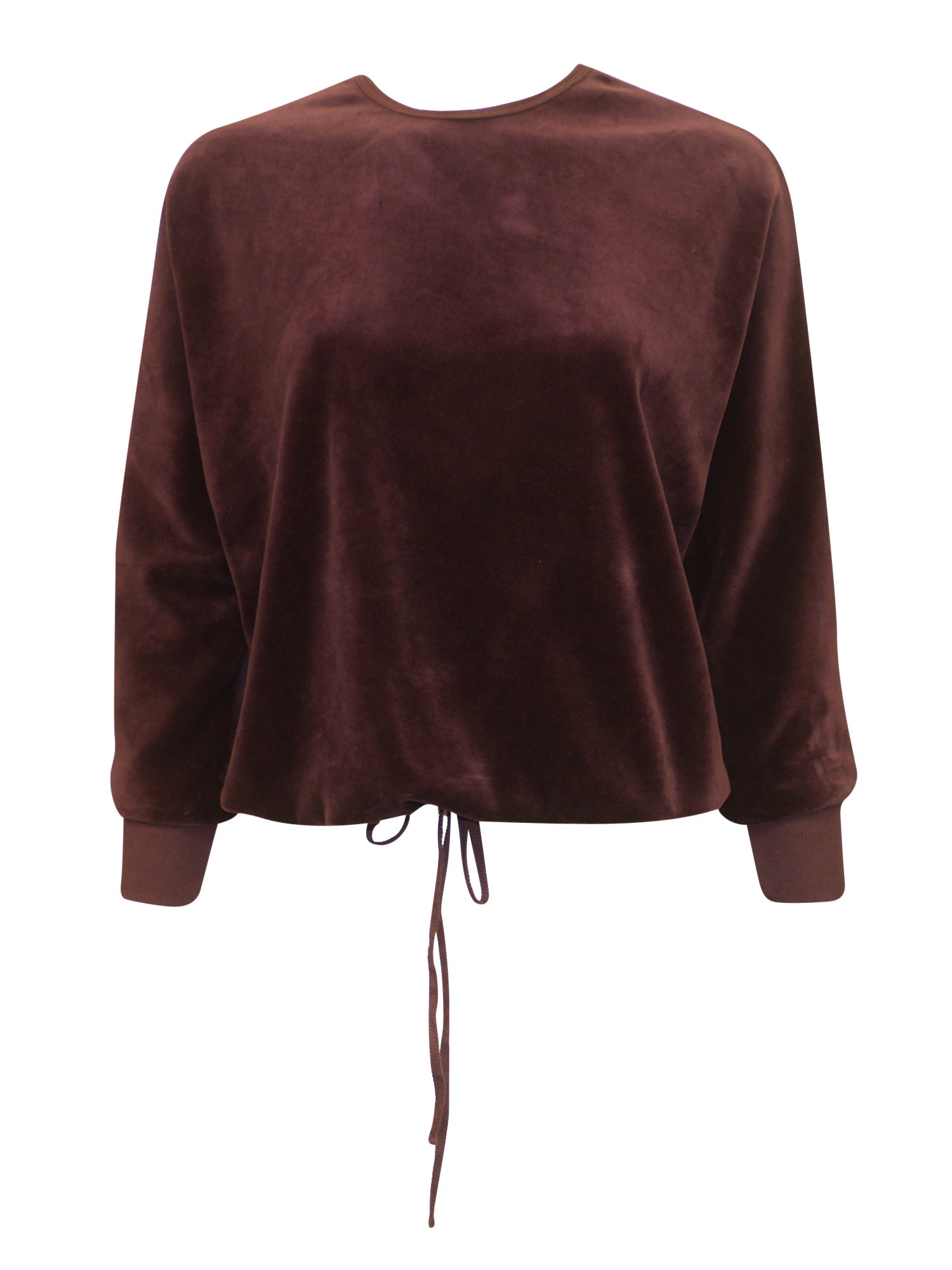 Forget stiff suits and body-con dresses – embrace cozy confidence with Hard Tail's velour crewneck top with a drawstring twist. Imagine this: