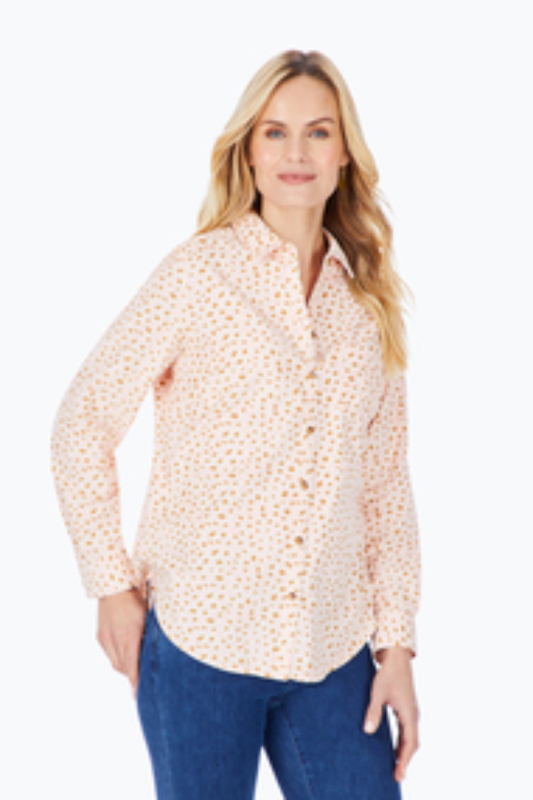 A meticulously-tailored shirt that’s easy to spot, this all cotton long sleeve features a fun mini-leopard print blotted with blush pink. Flowing lines and a hi-lo hem ensure this looser-fitting shirt shows only your best side.