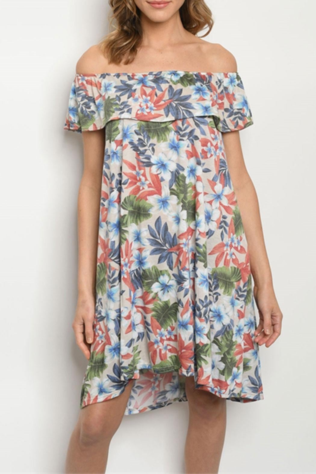 Taupe Floral Dress. Off-shoulder frill yoke floral dress. Description: L: 37" B: 38" W: 48"