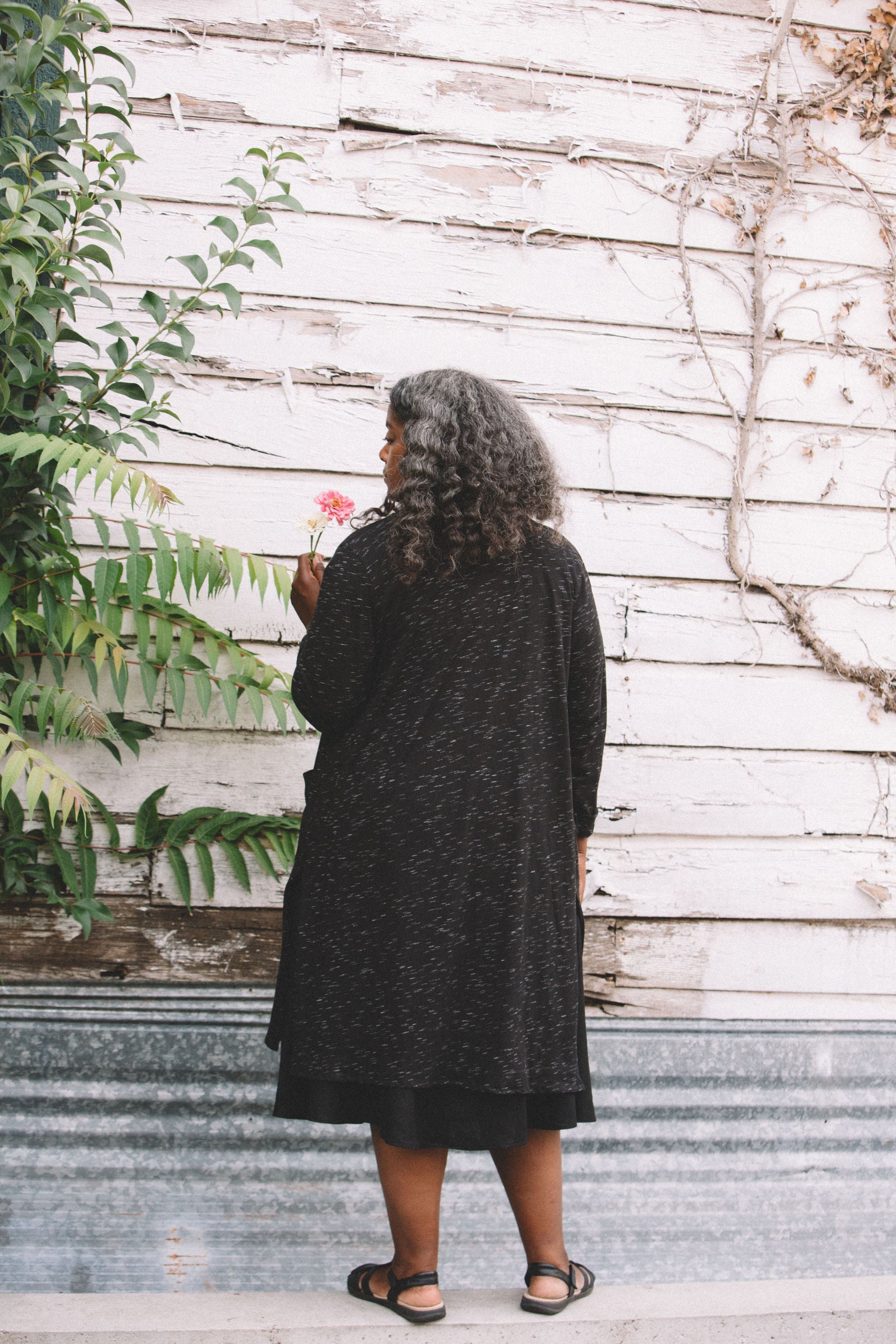 Our first ever long jacket. Easy on / off and pairs well with anything. Binded center front opening. 2 deep patch pockets for hands free necessities. Split bottom hem for easy movement and appeal.