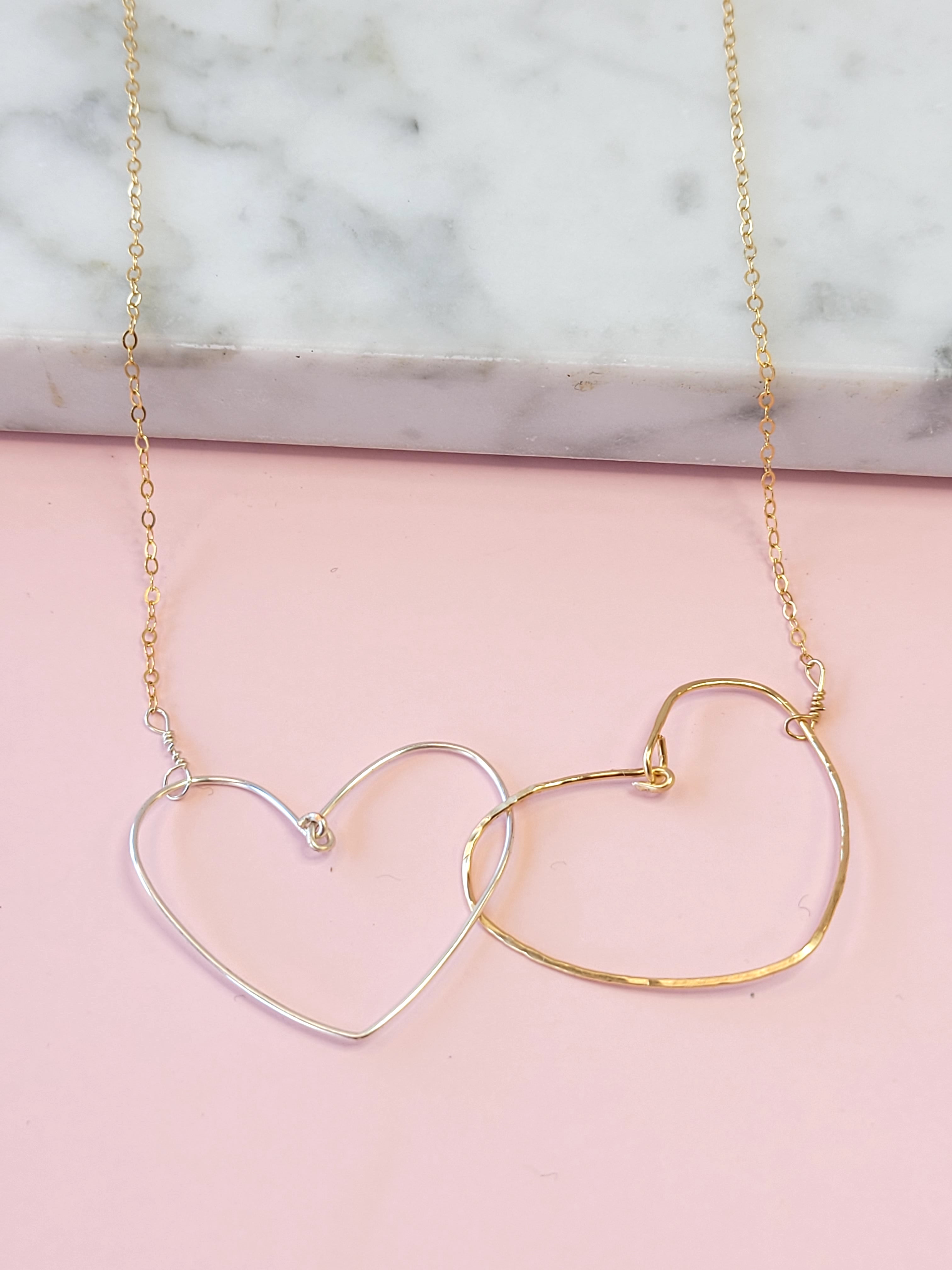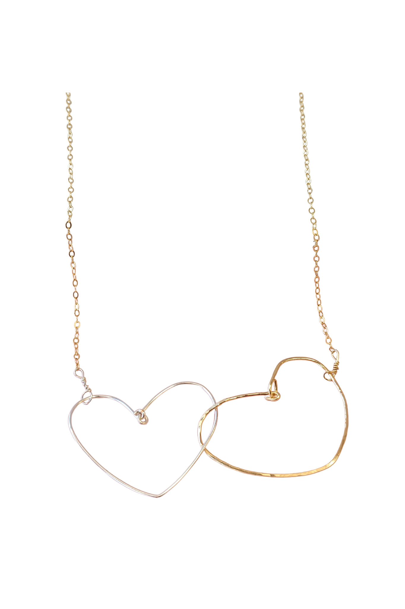 Two heart centerpiece necklace, with one gold and one silver heart, attached to a 14k gold chain.